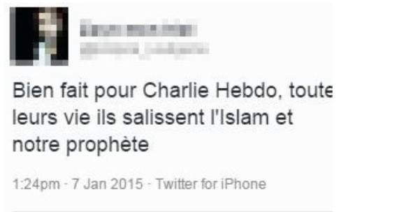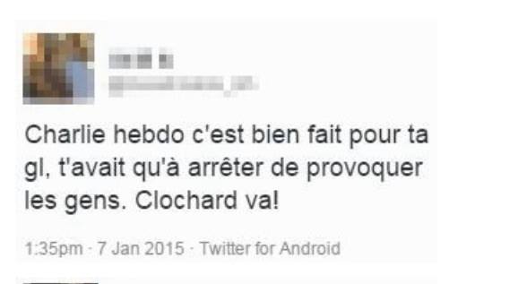 La, vous citez trois exemples, encore que je ne sois pas tout à fait d’accord avec vous. Si les deux derniers sont pleins de fiel et de haine, pas le premier! Maghnaoui dit qu’il a de la compassion pour les victimes, mais qu’il n’adhérait pas aux idées de Charlie hebdo, ce qui est évidemment son droit le plus extrême. Je ne vois aucune haine dans ce tweet contrairement aux deux autres.