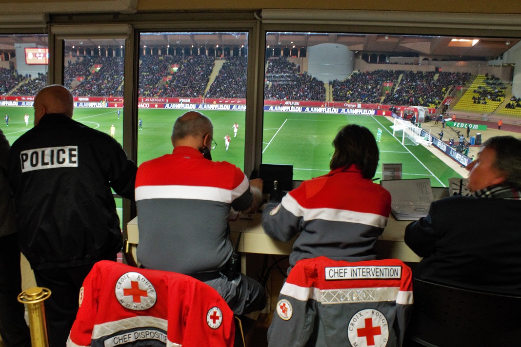 « Nous avons au total 50 bénévoles sur le dispositif, dont cinq infirmières de la Croix-Rouge » précise Viviana Fraval, directrice adjointe du secourisme Répartis autour du stade Louis II, les volontaires de la Croix-Rouge veillent à la sécurité des supporters. En cas d’urgence, les équipes peuvent intervenir dans les plus brefs délais. Pour gérer toutes ces équipes, Rémy Tornatore, directeur du secourisme, s’est installé au poste de commandement : « D’ici on gère toutes les équipes sur le dispositif. » Depuis ce nid de pie, les responsables de l’association travaillent en coopération avec les pompiers, les services de l’ordre et les carabiniers du Prince. A l’aide de jumelles et de caméras, les différents responsables scrutent les supporters.