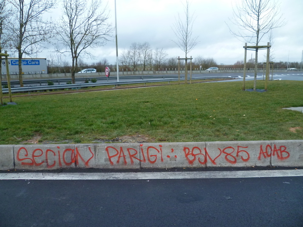 La deuxième voiture arrive enfin, sept Niçois à bord. Tout le monde est déjà bien chaud. Les premiers chants sont entonnés à la plus grande surprise des passants. Avant que les esprits se dispersent, on règle les frais du déplacement. 45 euros pour le covoiturage et la place au stade, effectivement, lorsqu’on est étudiant, il s’agit d’un réel effort. Nous reprenons la route, musiques niçoises à tue-tête dans la voiture. Mais le prochain arrêt ne tarde pas. Certains en profitent pour marquer le territoire. C’est comme cela que ça se passe dans le monde Ultra. On sticke sur des panneaux, là où des autocollants de supporters parisiens ou stéphanois sont déjà présents. D’autres y vont de leur tag : « SECIOUN PARIGI : BSN 85 ACAB ». Comprenez « All cops are bastards » pour le dernier acronyme.