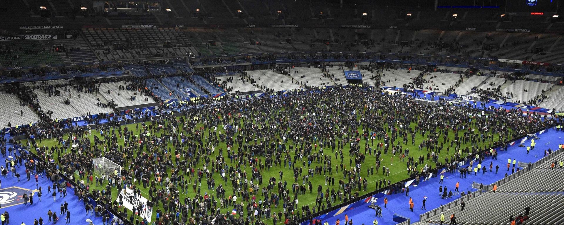 Alors que l’Equipe de France de football s’imposait deux buts à zéro face à l’Allemagne, des attentats terroristes d’une ampleur inédite éclataient aux abords du Stade de France et dans Paris. Des scènes de panique ont été observées aux abords de l’enceinte à l’issue de la rencontre, tandis que des centaines de supporters se sont réfugiés sur la pelouse du stade.