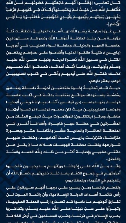 Suite aux attentats de la nuit du 13 novembre, Daesh a revendiqué l’attaque au matin, par le biais d’un communiqué en français. Le président de la République François Hollande avait confirmé quelques minutes plus tôt cette information face à la presse.