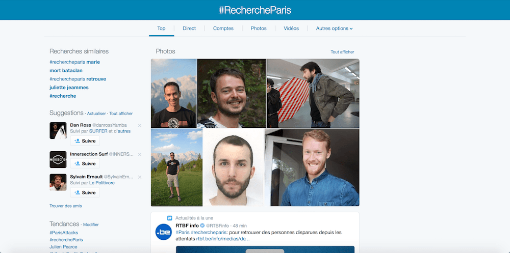 « Cecile Misse, 1m65, visage rond, cheveux mi longs bouclés et clairs, Bataclan hier.#rechercheParis #ParisAttacks RT AU MAX »… Des messages de ce genre, les réseaux sociaux en sont noircis depuis hier soir. Dans le feu de l’action et l’avalanche d’informations qui suivirent les explosions, certains manquent rapidement à l’appel. Des avis de recherches concoctés par les proches de disparus sont postés sur Twitter sous le mot clés #rechercheparis. Ce à quoi les internautes répondent quand ils ont des informations, ou « retweetent » (font passer) pour disperser les avis de recherches, qui ciblent particulièrement les 1500 personnes présentes dans la salle attaquée du Bataclan. A la mi-journée le hashtag avait été partagé presque 20.000 fois, et relayé sur Facebook.
