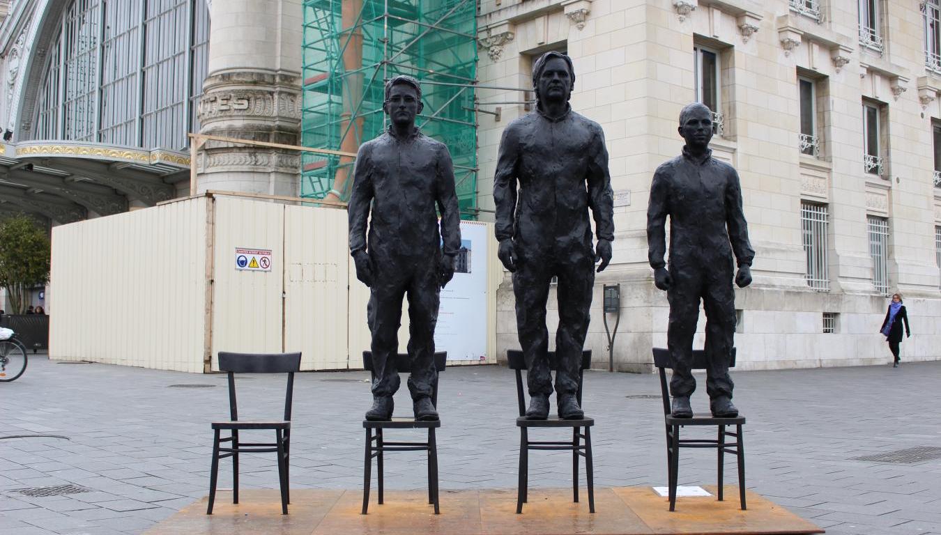Mais la sensibilisation commence dès la fin de l’atelier. Le public est invité à sortir du Centre de congrès pour aller voir une sculpture de l’Italien Davide Dormino, à côté de la gare de Tours. Intitulée Anything to say?, l’œuvre représente Edward Snowden, Julian Assange et Chelsea Manning, debout sur des chaises. Une quatrième chaise a été laissée vide par Davide Dormino, comme une invitation à aller les rejoindre. « Le courage est contagieux », explique-t-il en souriant.