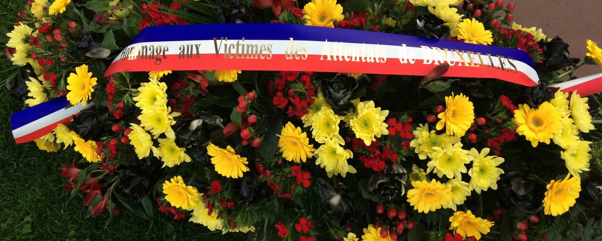 Après avoir joué la sonnerie aux morts, cette gerbe de fleurs a été déposée près du monument aux morts. (Crédit : Thomas Woloch)