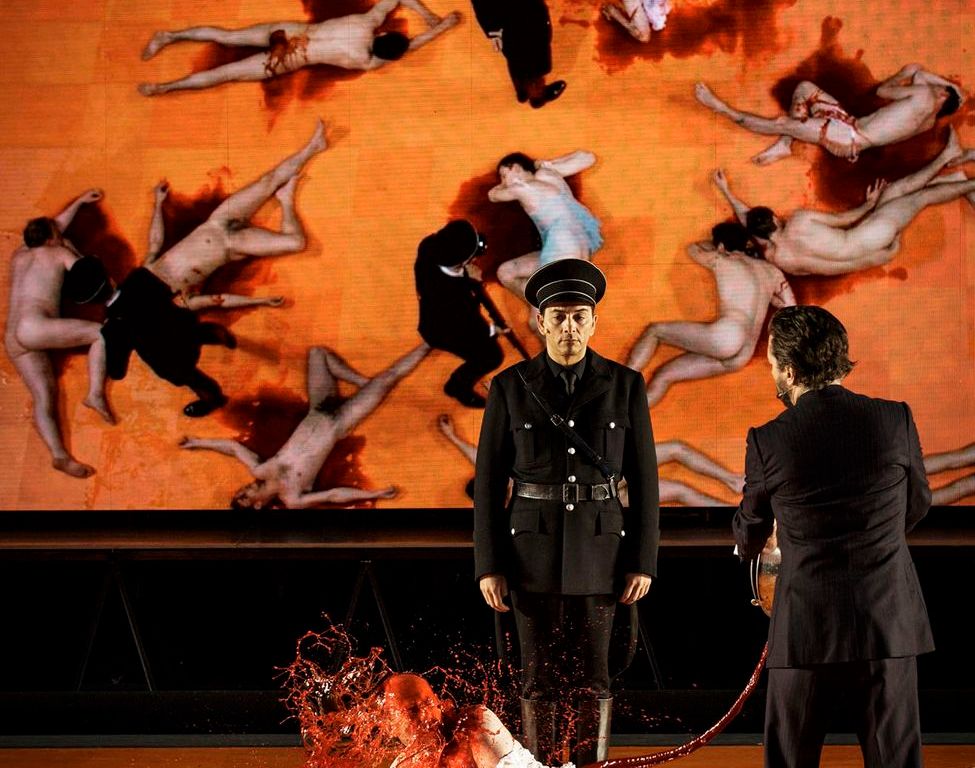 Derrière l’orchestre, sept cercueils alignés attendent d’être remplis. Ainsi, le public en déduit que sept personnages ne survivront pas au spectacle. Mortel. D’autant plus qu’à chaque fois qu’un couvercle se referme sur un mort, les spectateurs le voient hurler et agoniser en gros plan sur l’écran.
