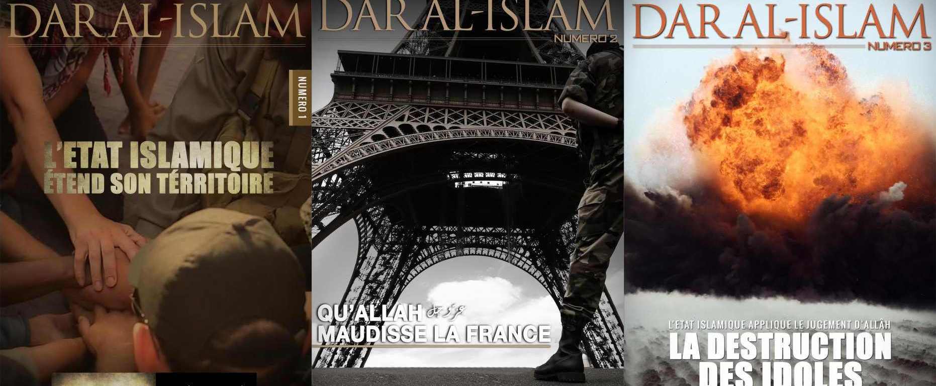 Dar al-islam signifie la maison de l’islam en arabe. C’est aussi une locution utilisée pour désigner les parties du monde où les lois islamiques gouvernent. C’est dans cette idéologie maximaliste qu’est fondé par Daesh le magazine éponyme. Publié en décembre 2014, le premier numéro annonçait la couleur. Intitulé « L’État islamique étend son territoire », ce numéro était un éloge de la hijra, c’est à dire l’émigration vers « le califat ». Ainsi, l’objectif premier de Daesh à travers ce journal est de recruter en Occident. « L’objectif principal de ces magazines, c’est le recrutement. Ils ciblent les pays les plus stratégiques à l’international : les pays francophones (France, Belgique, pays d’Afrique), la Russie, la Turquie », explique l’expert en communication Mathieu Slama. Étant à destination d’un public français, Dar al-islam reprend tous les codes de la presse française. On retrouve ainsi des éditos, des reportages, ou encore des interviews. On trouve ainsi des articles comme « Attaquer ceux qui insultent le Prophète », « L‘histoire de l‘inimitié de la France envers l‘Islam », ou encore « Le salut par l‘allégeance et l‘épée ». Le ton est extrêmement offensif et les images de cadavres sont nombreuses.