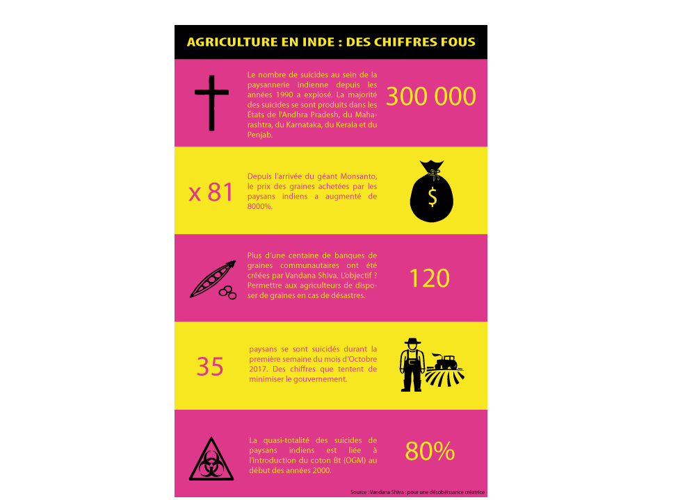 « La paix, une utopie indispensable ». C’était le thème de la conférence à laquelle a participé Vandana Shiva pendant le Festival du livre de Mouans-Sartoux, samedi 8 octobre. Pour elle, impossible de dissocier la paix de la souveraineté alimentaire. Dénonçant le géant Monsanto qui « tue les agriculteurs indiens », la prix Nobel alternatif 1993 a martelé que la paix ne pouvait être conquise que par « l’émancipation du pouvoir des multinationales ». S’appuyant sur des chiffres clés concernant les OGM en Inde, Vandana Shiva a appelé à « désobéir ». Des chiffres que l’on vous propose de retrouver dans cette infographie.