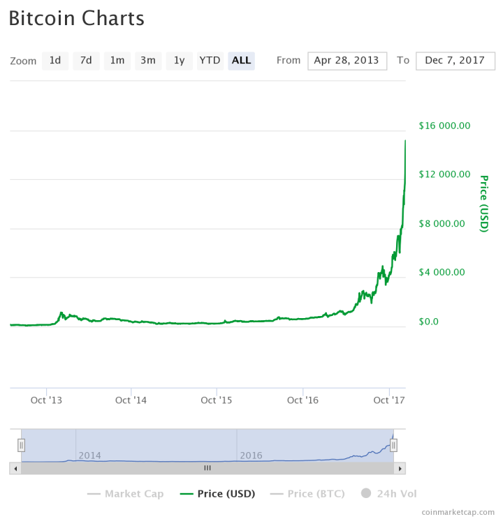 Le Bitcoin (BTC) est la cryptomonnaie la plus connue, la plus chère (son prix avoisine les 15300 $ actuellement) mais aussi la plus répandue – le Bitcoin représente à lui seul près de 62 % de la valeur totale du marché des cryptomonnaies. Lancé le 3 janvier 2009 par une personne sous le pseudonyme de Satoshi Nakamoto, le Bitcoin avait une valeur très faible : il valait 0,001 $ le 5 octobre 2009 (~0,00071€ à l’époque). Sa valeur a donc été multiplié par plus de 15 000 000 environ en 8 ans. On ne sait pas qui est Satoshi Nakamoto, si c’est une personne ou plusieurs, un homme ou une femme, s’il est Japonais, Américain, Français ou Chinois. Son pseudonyme laisse supposer que c’est un homme japonais.
