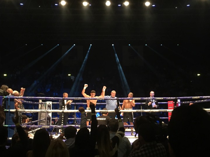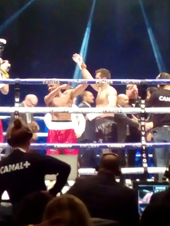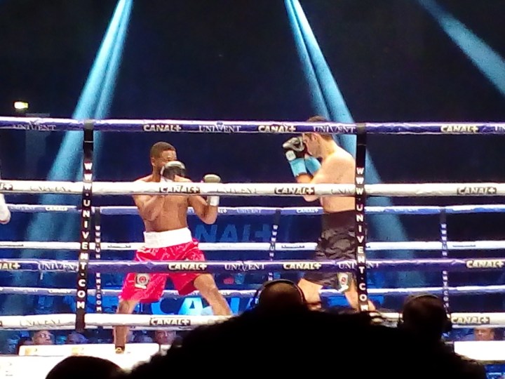 Pour terminer, le moment fort de la soirée opposait le Français Doudou Ngumbu (37-7-0) au Russe Igor Mikhalkin (20-1-0), pour la ceinture IBO de champion du monde des mi-lourds. Le combat, rythmé par les « Allez Doudou » du public, fut engagé du début à la fin. Le Français a mené la cadence, en allant vers son adversaire et en se donnant à fond dès le début. C’est son physique qui lui a fait défaut, car il a rapidement calé et n’a pas tenu la distance, et le Russe en a profité pour placer ses coups au bon moment. Ngumbu a tenu jusqu’au bout, n’abandonnant jamais, ce qui est d’autant plus remarquable étant donné qu’il était présent en remplacement de Mickael Diallo, premier adversaire de Mikhalkin ayant déclaré forfait. Mais il s’inclina malheureusement aux points, par décision unanime (117-111 ; 116-112 ; 116-112). Mikhalkin conserve donc sa ceinture après un combat maîtrisé de bout en bout, même s’il a été mis en danger lors de coups d’éclats du Français.