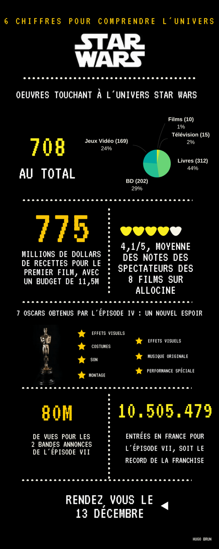 Le mercredi 13 décembre sort en France l’épisode 8 de la saga de science-fiction Star Wars : Les Derniers Jedi. Rapidement passé à la postérité, l’univers créé par Georges Lucas provoque un évènement planétaire à chaque nouveau film. Buzzles vous propose de comprendre, à l’aide de dates et chiffres importants, cet univers culte.