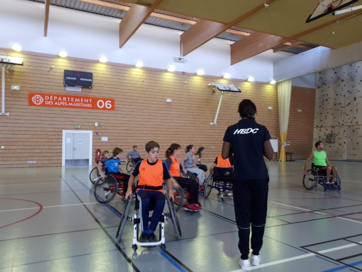 Au gymnase du Bois-de-Saint-Jaume, situé près du collège du Rouret – une commune à proximité de Biot et d’Opio-, le tableau d’affichage indique 11h30. En ce samedi matin de novembre, les plus petits du Handball des Collines (âgés de 2 à 5 ans) viennent tout juste de terminer leur entraînement. Même si la grande majorité de ces débutants quittent la salle, Valentine, 6 ans, et sa copine Dorine restent sur le terrain. Elles vont participer à la séance de hand fauteuil qui mélange petits et grands, handicapés et valides, sans distinction.