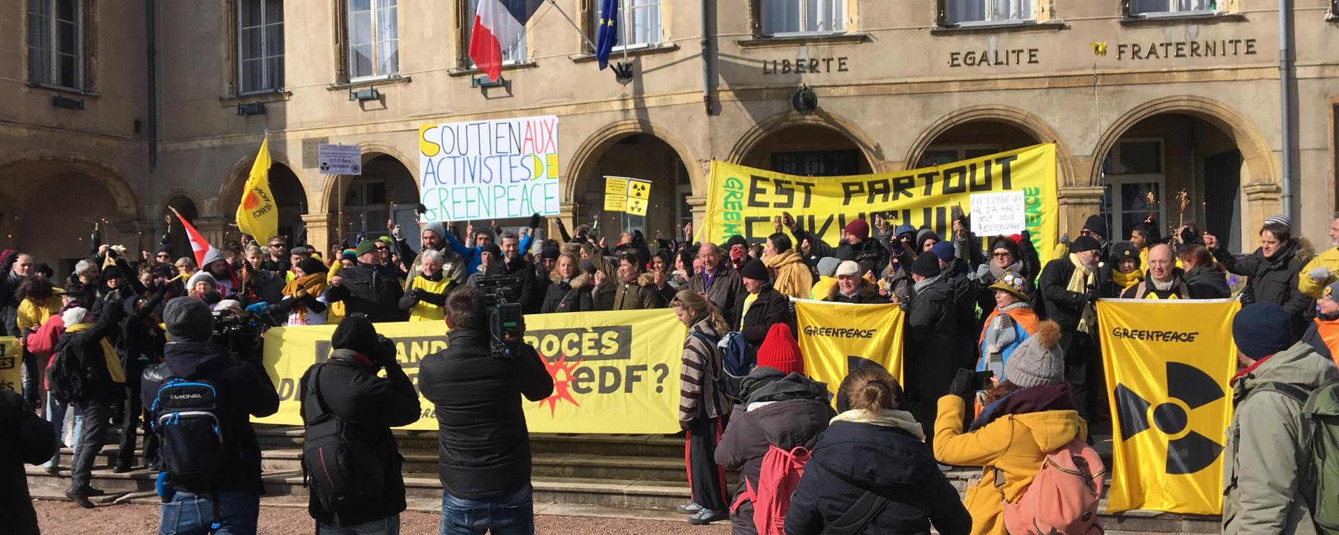 Des dizaines de militants ou sympathisants de Greenpeace se sont mobilisés à Thionville pour apporter leur soutien à 8 militants de l’ONG. Ces derniers faisaient face à la justice suite à une opération coup de poing menée à la centrale nucléaire de Cattenom, en Moselle, le 12 octobre dernier. Ils s’étaient introduits dans l’enceinte EDF et avaient allumé des fusées près de la piscine d’entreposage des combustibles usés, zone dans laquelle la radiation est deux à trois fois plus élevée que dans le reste du parc. Le but était de dénoncer le manque de sécurité des installations nucléaires en France. EDF a par la suite déposé plainte contre les activistes et contre l’ONG elle-même, représentée par Jean-François Julliard en raison de son poste de directeur général de Greenpeace France. Il leur était demandé plus de 700 000€ de réparation, dont 500 000€ pour « atteinte à sa crédibilité ». « Nous sommes là pour les soutenir, pour se défendre devant la justice, assure Cyril Cormier, responsable des campagnes énergie et climat de l’ONG, montrer qu’il y avait une nécessité d’agir, de démontrer qu’EDF ne fait pas son travail en matière de sécurité nucléaire ».
