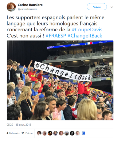En France, le président de la FFT Bernard Giudicelli a voté en faveur de cette réforme de l’épreuve. Un choix vivement critiqué par les joueurs et les supporters. Les « conservateurs » critiquent un vote qu’ils considèrent purement économique. La réforme verra en effet rentrer dans la danse un nouveau partenaire commercial, chargé du développement de la nouvelle formule de compétition : le groupe industriel Kosmos. Ce partenariat devrait rapporter entre 2,5 et 3 milliards d’euros à l’ITF sur 25 ans. Le prize money reversé aux joueurs devrait considérablement augmenter (au minimum vingt millions d’euros leurs seront garantis chaque année) afin d’appâter les meilleurs tennismen de la planète. En guise de protestation contre ce tennis jugé bling-bling, un mouvement en ligne été lancé avec le hashtag #changeitback au niveau international pour que les élus reviennent sur leur décision :
