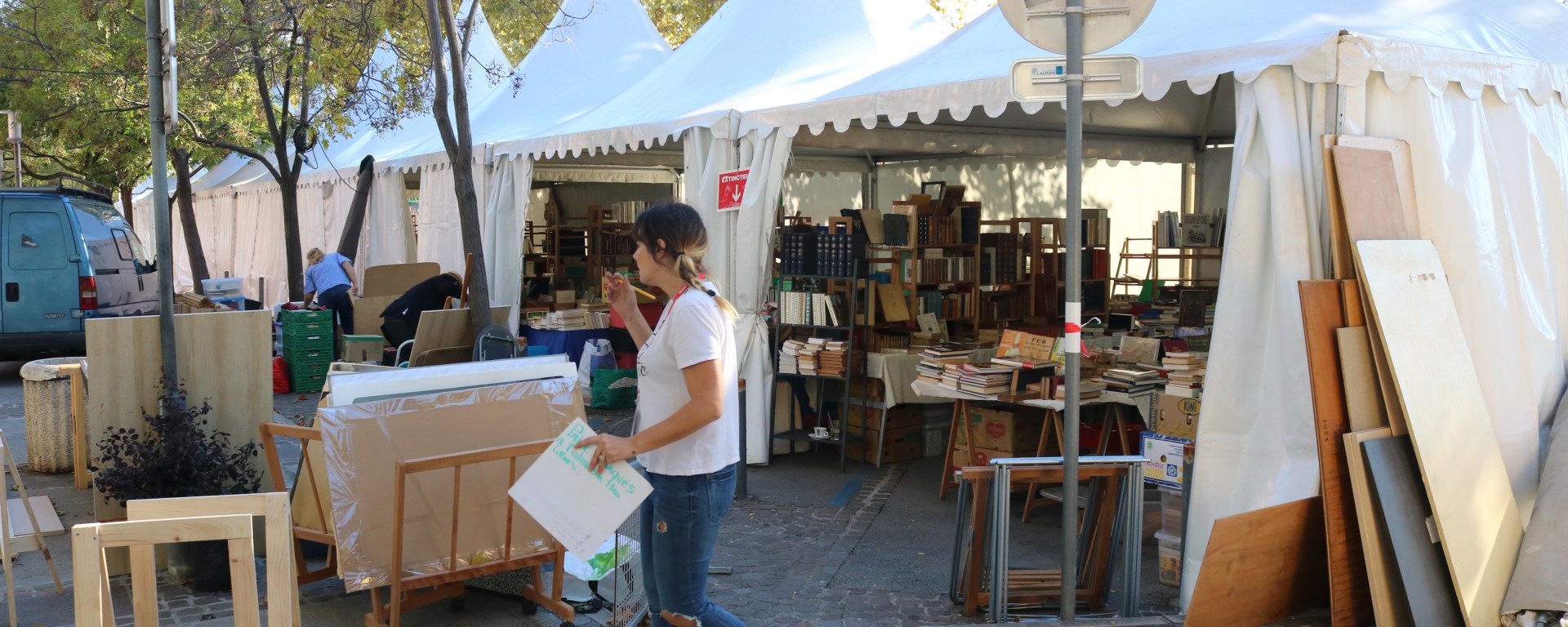 Depuis trois ans, le festival de Mouans-Sartoux est piétonnisé, depuis l’attentat de Nice. Toute la partie extérieure, où se trouve le marché des livres, est interdite aux voitures à partir de 9h. Un choix qui impacte directement les bouquinistes.