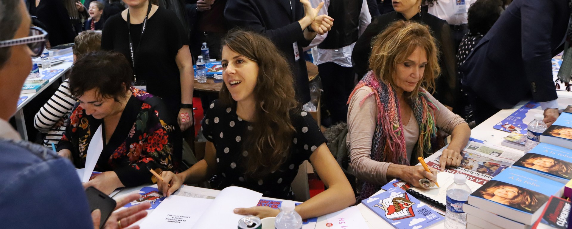 N : Moi je sais que des fois je suis tellement fatiguée que je ne comprends plus ce que les gens me disent. Par exemple ils me disent « c’est pour ma soeur qui s’appelle Claudine mais moi je m’appelle nanana et on va lui offrir », du coup je confonds tous les prénoms et entre deux personnes je mets n’importe quoi. Entre temps la personne s’en va avec son livre dédicacé. Une heure après elle lit ce que je lui ait écrit, et elle se dit « mais elle a rien compris » donc la personne revient, elle me dit « excusez moi mais ce n’est pas ça. Ma soeur c’est Agnès, moi je ne sais pas qui est Francine ». Donc je m’excuse et je lui fais une grosse rature.