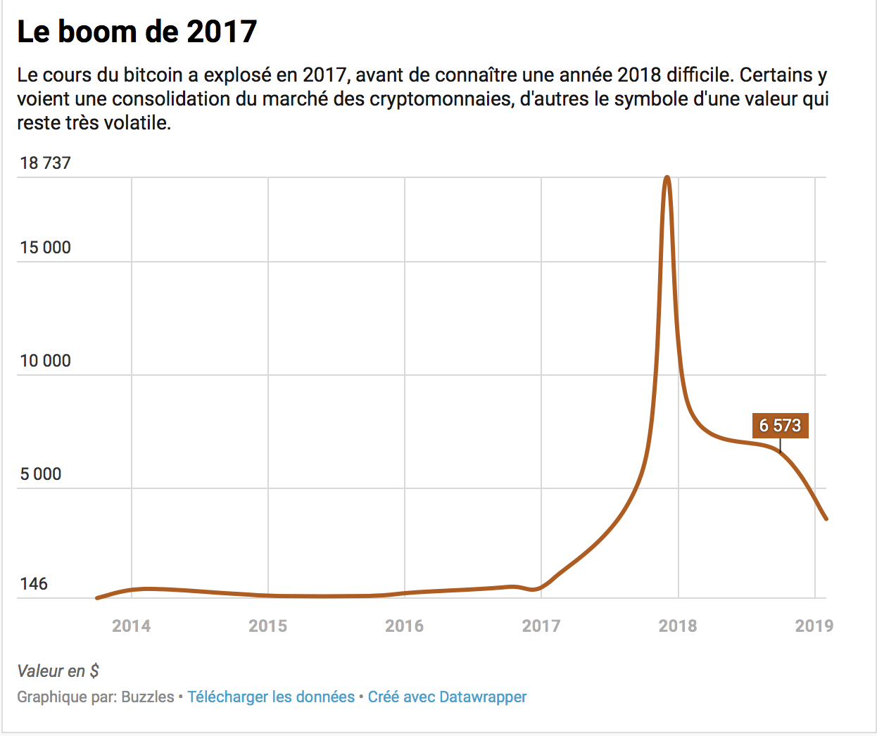 Surtout, les monnaies virtuelles vont de plus en plus pénétrer la société, et ses usages se démocratiser. Mais c’est aussi une valeur très volatile qui reste en berne depuis le dernier pic atteint en décembre 2017.