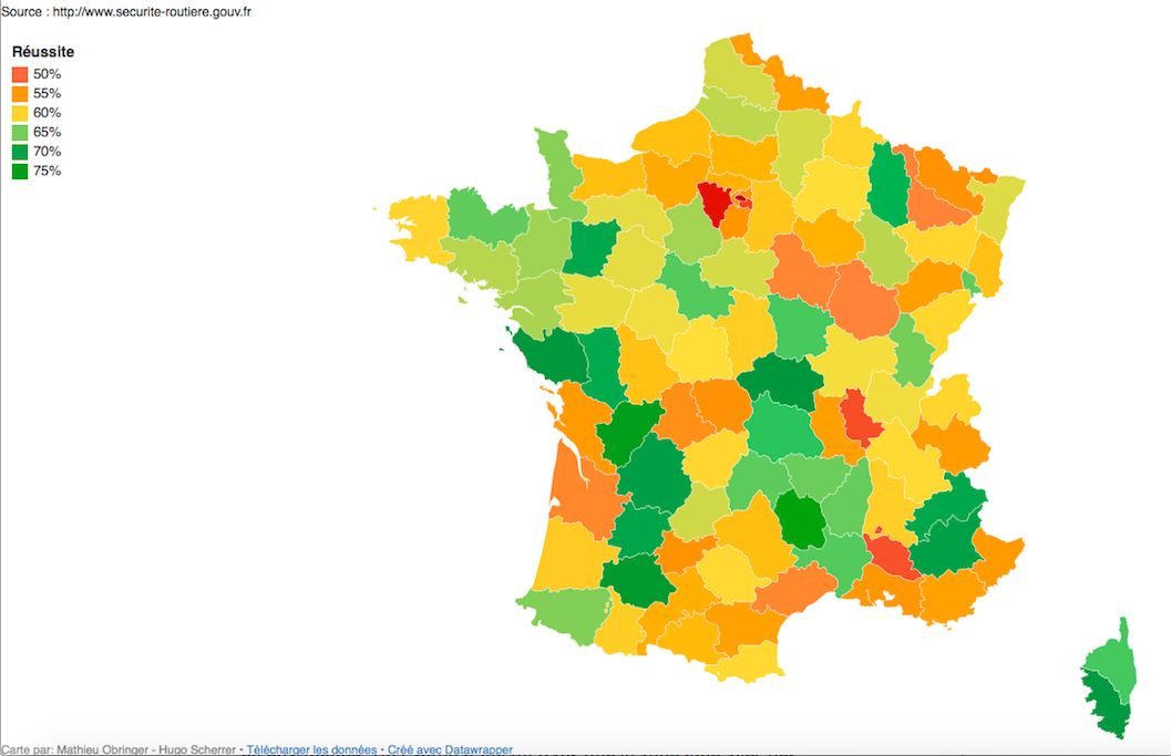Les départements où les coûts du permis sont les moins chers sont aussi ceux où le taux de réussite est le plus élevé (60,57% de réussite contre 55,39% dans les départements les plus chers). Le taux de réussite moyen des neuf départements où le permis est le moins cher s’élève à 60,57%, bien au dessus des 55,4% des neuf départements où il est le plus cher.