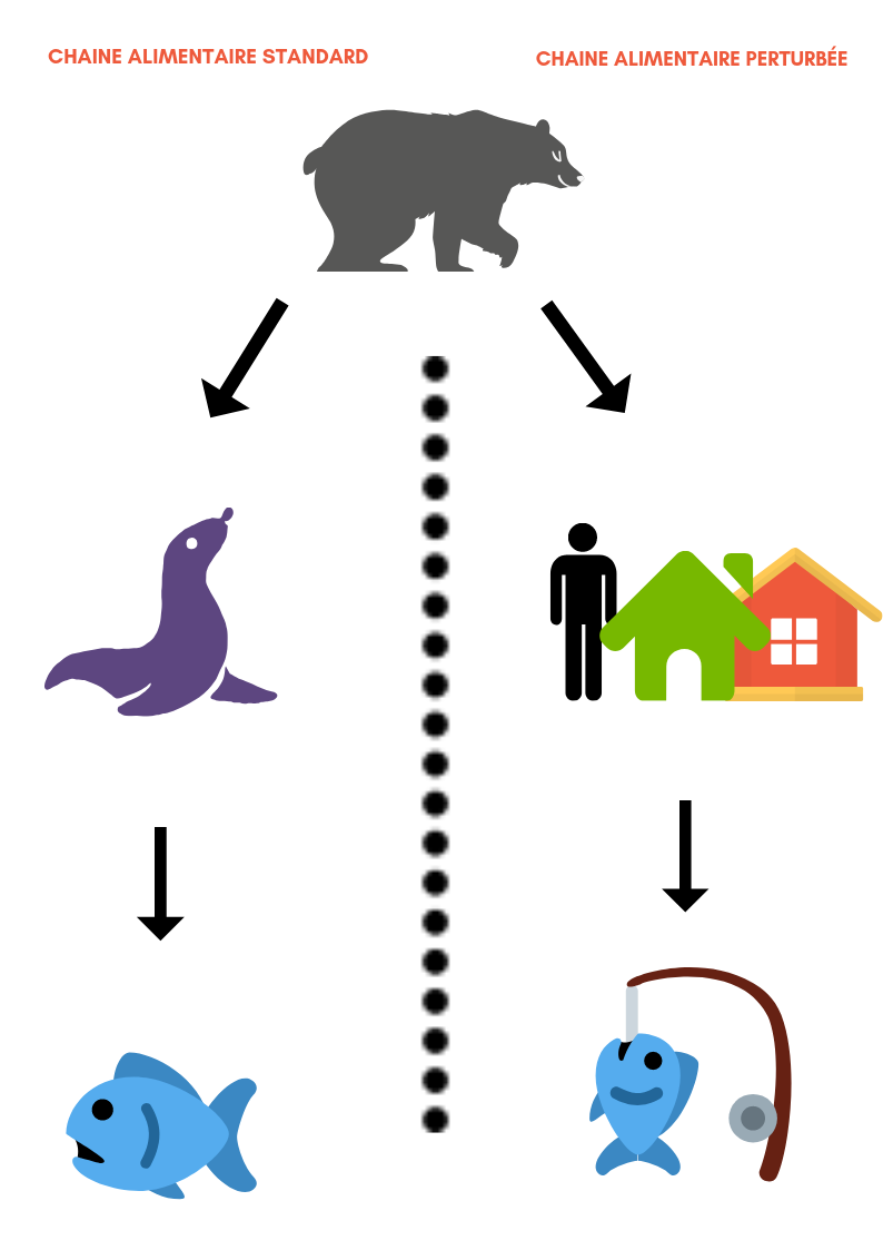 L’ours polaire est carnivore. Il se nourrit essentiellement de phoques ou de morses. Leur présence est impossible en l’absence de banquises. Par ailleurs, ces phoques se nourrissent, eux, de nombreux poissons dont le cabillaud. Un maillon de la chaîne qui est abondamment pêché par l’Homme.