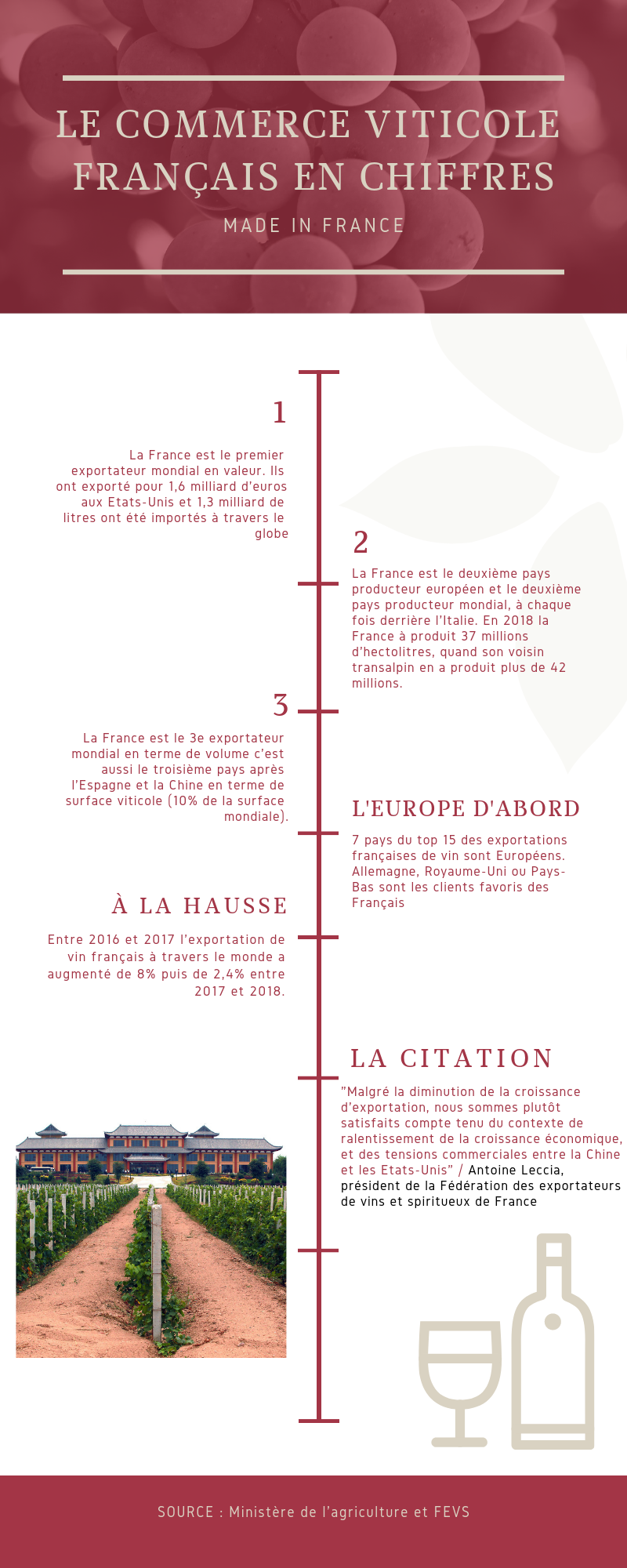 Les hommes mentent pas les chiffres, en étant dans le top 3 en terme d’exportations, importations ou encore productions la France est aujourd’hui un leader emblématique du monde viticole. Les autres ne s’y trompent pas c’est bien le modèle français qu’il faut copier.