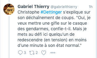 On repasse la vidéo au ralenti, le moment ou la seule témoin de cette affaire tombe par terre. Selon Christophe Dettinger c’est à cause d’un coup d’un gendarme. Mais l’image ne tranche pas, la présidente non plus. Le prévenu assure avoir mal réagi face à une situation qui lui semblait inégale.