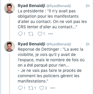 Une autre scène de violence est diffusée, Christophe Dettinger se jutifie en expliquant avoir vu des coups de matraques. Ils sont invisibles sur la vidéo.