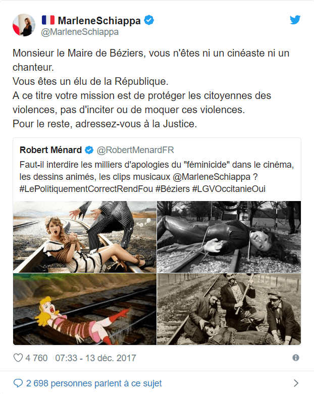 La secrétaire d’Etat avait rappelé à l’ordre le maire de Béziers sur Twitter. Robert Ménard s’était justifié en utilisant des exemples cinématographiques ou musicaux. Marlène Schiappa lui avait alors rappelé qu’il n’était pas un homme d’art, mais un politique.