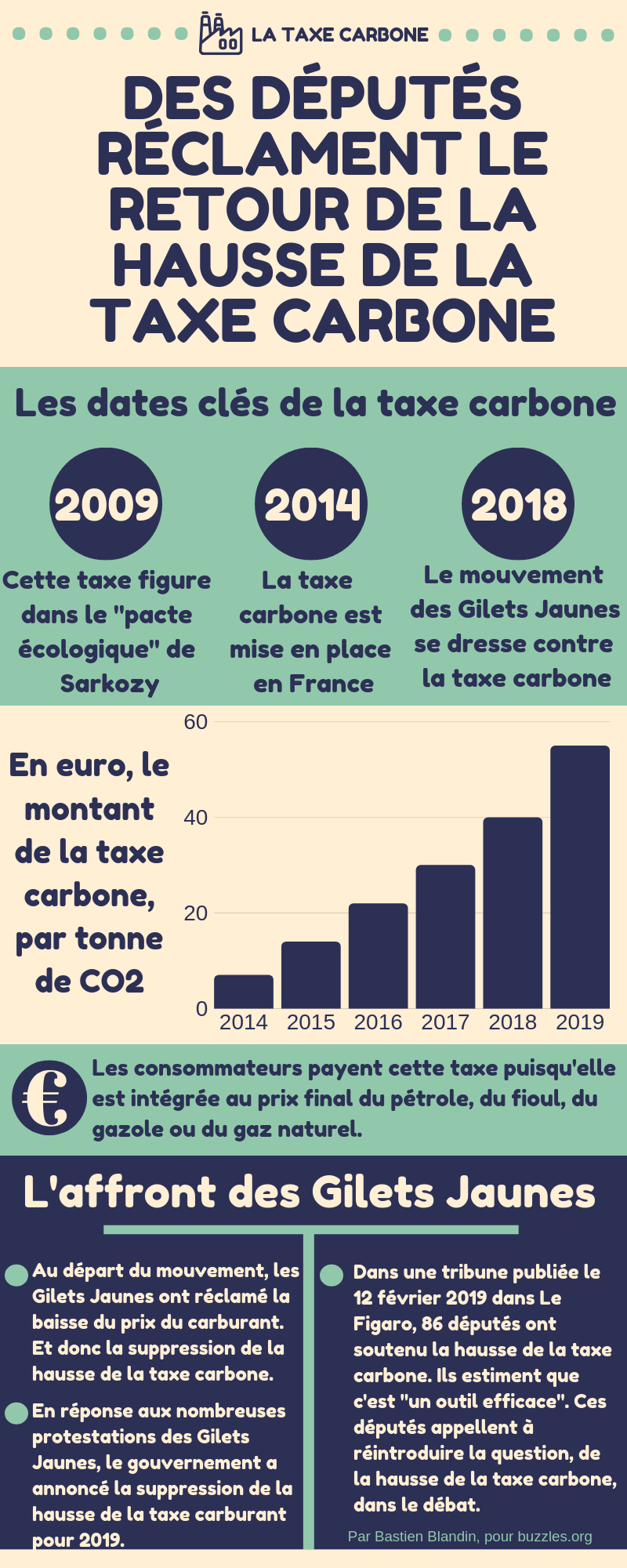 Dans une tribune publiée le 12 février 2019 dans Le Figaro, 86 députés ont soutenu la hausse de la taxe carbone. Ils estiment que c’est « un outil efficace ». Ces députés appellent à réintroduire la question, de la hausse de la taxe carbone, dans le débat.
