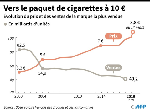 Avec une hausse de plus de 5,50 euros depuis le début des années 2000, les porte-monnaie des fumeurs sont sans cesse « mis à l’épreuve ». En conséquent, et c’est le but, un recul de la consommation de tabac est observé depuis 2009. Selon Emmanuelle Béguinot, directrice du Comité national contre le tabagisme (CNCT), « L’efficacité de la hausse des prix du tabac est liée au caractère significatif répété de la hausse. Si on a seulement de petites hausses, il y a un lissement des effets au cours du temps. (…) Avec cet objectif du paquet à 10 euros, on part dans de bonnes conditions. ». L’Organisation mondiale de la santé affirme que l’augmentation du prix du tabac est « le moyen le plus efficace de diminuer la consommation » ; une augmentation de 10% du prix du tabac pourrait réduire la consommation d’environ 4%.