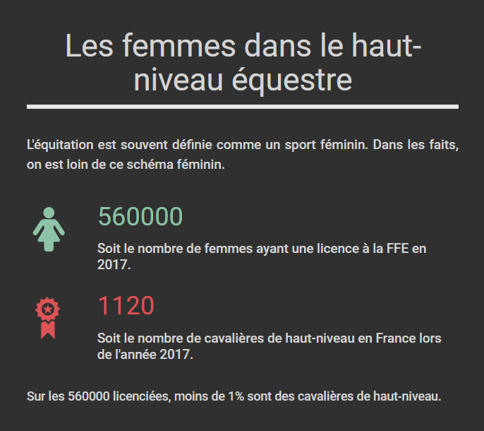 Le sexisme dans le sport est un débat vieux comme le monde. Jeux Olympiques et autres compétitions internationales sont décriés comme étant sexistes, dévalorisant l’image des sportives. À l’heure où les débats pour l’égalité homme-femme font rage, très peu de sports aujourd’hui parviennent à se donner une image paritaire, sans différenciation entre les deux genres. Le milieu équestre demeure, jusqu’à aujourd’hui, le seul terrain aux Jeux Olympiques où hommes et femmes concourent dans les mêmes catégories, mais aussi étalons/hongres et juments. L’équitation souvent définie comme « sport de femmes » est-elle réellement un sport de femmes ? C’est en effet ce que les statistiques tendent à démontrer. Cette discipline est, en théorie, souvent affiliée aux aspects féminins. Dans les faits, on est loin de véhiculer cette même image. Ne serait-ce donc pas un loisir de femmes et un sport d’hommes ?