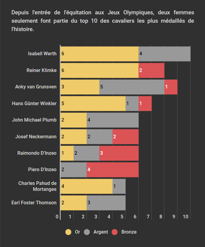 Le saut d’obstacles est de loin la compétition la plus suivie et appréciée par le public, mais c’est pourtant celle qui reflète le plus cette image de sexisme. Pourtant, cela serait une grosse erreur que de rester focaliser sur cette discipline. On peut observer que dans le dressage, le classement tend à la parité, le nombre d’hommes et de femmes étant quasiment identiques parmi les 100 meilleurs cavaliers du monde. C’est dans cette discipline, qu’à l’heure actuelle, on retrouve le plus grand nombre de femmes titrées, ainsi que la cavalière la plus titrée de tous les temps aux JO.