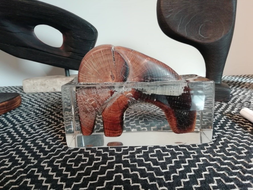 Sculpteur, mais aussi peintre à ses heures perdues, Philippe Remichi accorde une forte importance à l’art. Selon lui, cela est primordial, et sera un des seuls vestiges de notre société dans plusieurs années : « il nous restera au moins cela après le règne de l’intelligence artificielle » commente-t-il. Pour sa première exposition, ce dernier a également décidé de mettre en valeur des œuvres réalisées avec d’autres artistes, spécialisés dans d’autres types d’art. « L’Eléphant » (voir ci-dessus), une sculpture réalisée en partenariat avec Pascal Cervantes, un artiste qui travaille le plexiglas, en est l’illustration parfaite. Un éléphant en bois, travaillé par Philippe Remichi, flotte dans un « bain de plexiglas », comme le décrit l’artiste. Une œuvre du sculpteur hongrois Barna Gacsi est aussi exposé. Il a également collaboré avec Erik Salin, un artiste Pop-Art réputé dans de nombreux pays.