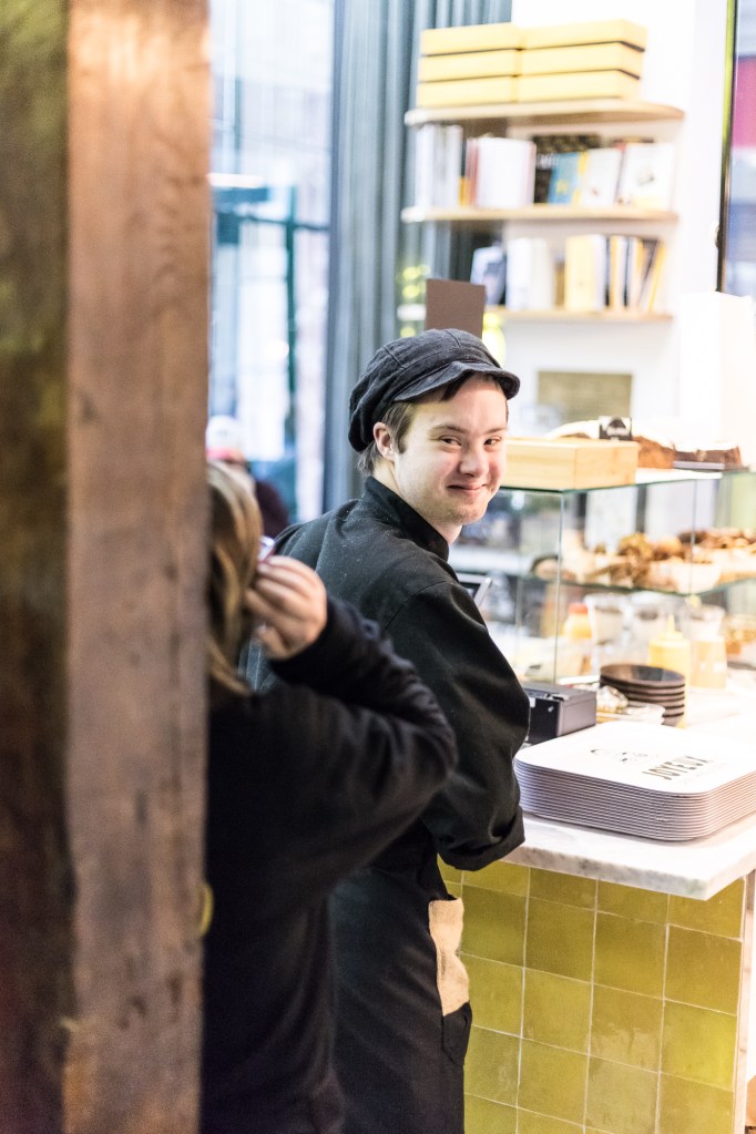 Au comptoir de Café Joyeux, Emmanuel accueille les clients. Sourire aux lèvres, il porte une blouse noire de cuisine et une casquette. Une odeur de pâtisseries tout juste sorties du four embaume la pièce. Au menu : carotte cake, quiche et cookies fait maison. Porteur de trisomie, le jeune homme travaille depuis près d’un an à Joyeux Paris. Il s’apprête à fêter, avec toute l’équipe, la première année de vie du coffee-shop. Un grand pas pour lui qui n’a jamais pu travailler auparavant. Une grande fierté surtout.