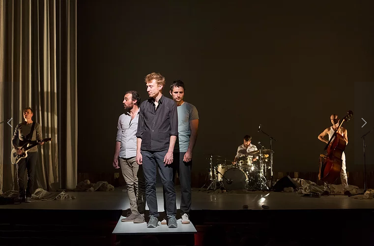 À ce trio d’orateurs s’en ajoute un second. Des musiciens sont aussi sur scène : un guitariste (Lionel Laquerrière), un batteur (Yoann Buffeteau) et un contrebassiste (Astérion). Ils accompagnent les silences, et les comédiens. Quand les mots ne suffisent plus à dire le manque et l’incompréhension, ce sont les notes de musique et les gammes qui prennent le relais. Elles sont aussi paisibles que les souvenirs d’enfance ; et aussi cacophoniques que la colère sans borne du personnage. Le trio de voix se mêle au trio d’instruments en une spirale doucement chaotique.