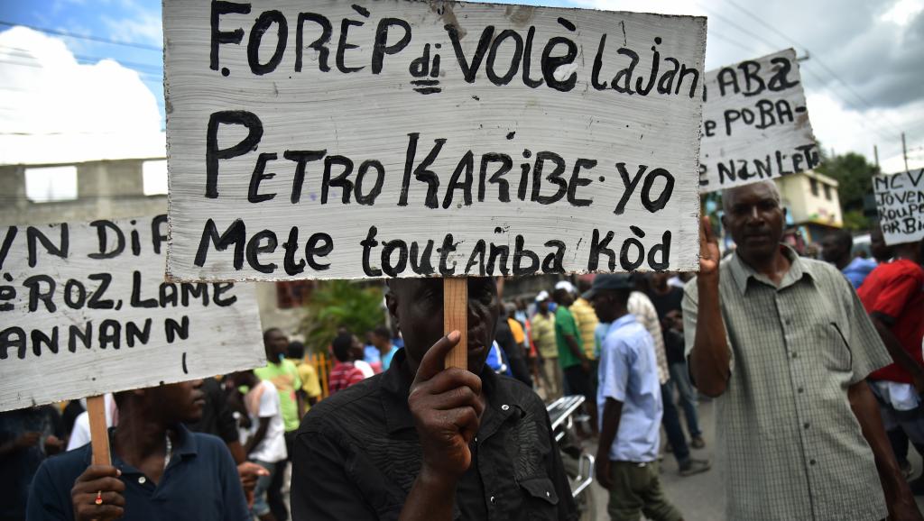 Depuis février 2017, Jovenel Moïse est président d’Haïti. Il a été élu sur la promesse de mettre « à manger dans toutes les assiettes et de l’argent dans les poches ». Pourtant, le pays ne se porte pas mieux. Pire, une affaire de corruption à hauteur de 3 milliards de dollars – impliquant le président lui-même, une quinzaine d’anciens ministres et hauts fonctionnaires – a éclaté. C’est le scandale PetroCaribe. PetroCaribe est une alliance pétrolière qui permet aux pays caribéens d’avoir accès à du pétrole vénézuélien à prix préférentiel ; ce qui offre la possibilité à Haïti de financer son développement. Mais un rapport de la Cour supérieure des comptes paru en janvier a mis en lumière ce qui était soupçonné depuis plusieurs mois : les fonds attribués à l’alliance auraient été détournés. Une part de la somme a été allouée à la construction d’une route, sans contrat (construite par la société anciennement présidée par Jovenel Moïse). Pour dénoncer la corruption qui gangrène le pays depuis des décennies et les conditions de vie catastrophiques, les Haïtiens sont dans les rues depuis août 2018. Cela fait plusieurs mois que le pays est bloqué par des manifestations demandant la démission de Jovenel Moïse. Au moins sept personnes ont été tuées, et soixante-dix-huit détenus de la prison d’Aquin (sur la côte sud) se sont évadés au cours d’un rassemblement à côté du centre pénitentiaire.