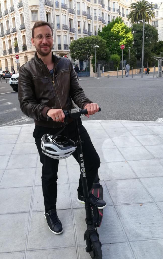 Cyril, professeur à l’Université de Nice Côte d’Azur, a acheté sa trottinette il y a presque un an. Au début il était assez dubitatif et ne se voyait pas se déplacer “sur un engin utilisé par des enfants de 7 ans”. Finalement, il décide d’en louer une pour essayer : “j’ai halluciné et je l’ai acheté”. Pour lui, c’est un moyen de transport “très pratique, fun, léger, économique et facile à transporter”. Il l’utilise pour aller travailler et a déjà fait plus de 1 600 km en 10 mois. Au cours de ses trajets, il tente d’être le plus vigilant possible. Il dit privilégier les pistes cyclables aux trottoirs et fait généralement des signaux pour indiquer sa direction. Mais Cyril reconnaît également la dangerosité de l’appareil. Il est déjà tombé 6 fois : “on va rapidement vite, on ne s’en rend pas compte et on est vulnérable”. Il confie ne porter un casque “qu’une fois sur cent” mais essaie de se protéger au maximum pour ses proches et son assurance. “Il y a un vide juridique”, en effet la nouveauté de l’engin met en difficulté la prise en charge en cas d’accident. Cet usager quotidien cherche d’ailleurs à souscrire une assurance spécifique aux trottinettes. Aujourd’hui seule deux organismes en proposent. Cyril tient tout de même à interpeller ces utilisateurs “il faut être extrêmement vigilant, on se rend pas compte qu’on va vite, on reste plus vulnérable que sur un vélo, les accidents arrivent plus vite”.