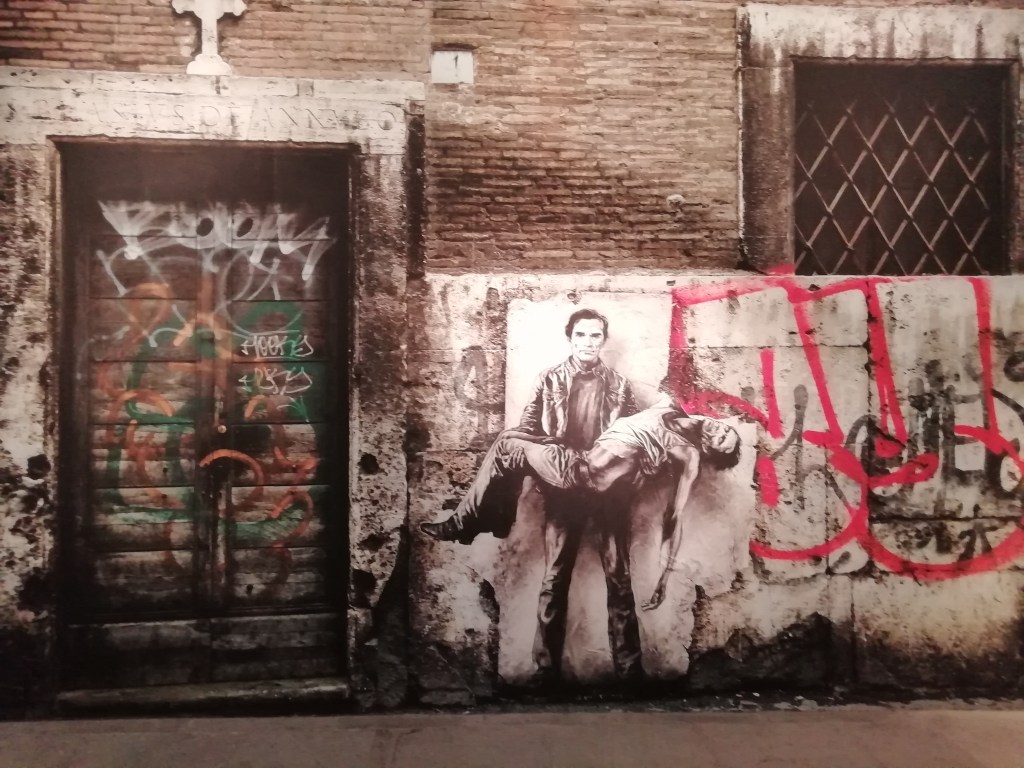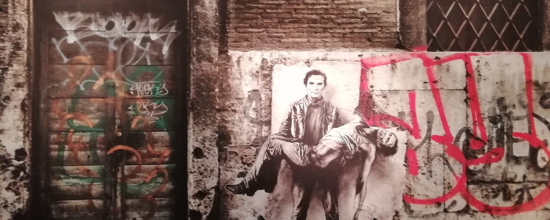 Ce qui marque lorsque l’on découvre les travaux d’Ernest Pignon-Ernest, c’est leur aspect sombre. Pour véhiculer ses idées, l’artiste a choisi de magnifier la misère et le désespoir. D’abord, en produisant uniquement des œuvres en noir et blanc. Mais surtout grâce à un coup de crayon extrêmement précis. Comme s’il ne fallait qu’il ne manque aucun détail des réalités qu’il dénonce. Depuis les drapés des linceuls des communards sur le parvis du Sacré Cœur et des prisonniers sur les murs de la Prison Saint-Paul de Lyon jusqu’à l’expression d’infini désespoir d’une femme avortée sur un trottoir parisien, chaque coup de crayon est comme une gifle au visiteur, qui pour l’artiste est bien trop souvent un spectateur passif de la misère.