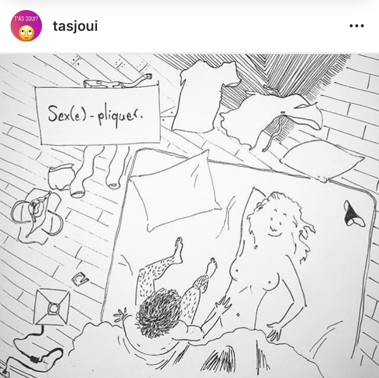 Dora Moutot, ancienne rédactrice en chef adjoint de Konbini, a lancé sur Instagram son propre compte et le nom est équivoque : @t’as joui ? Si la question semble bienveillante aux premiers abords, elle représente aussi le malaise et l’ignorance des hommes lorsqu’il s’agit de faire jouir leur partenaire. Dora Moutot y dénonce ces mythes devenus courants : « La sexualité féminine, c’est compliqué » et « chez les filles, la jouissance est plus cérébrale. » Selon elle, ces idées permettent aux hommes de cacher leurs méconnaissances ou leur manque d’intérêt pour le plaisir féminin. Son compte est alors un endroit où les femmes, comme les hommes, peuvent s’exprimer librement, témoigner sur leur rapport au plaisir. Les tabous sont au placard et tout y passe : masturbation, simulation, règles, poils, violences sexuelles ou psychologiques… Apprendre à aimer son corps, se détacher de ces illusions selon lesquelles les seins sont naturellement parfaitement arrondis ou que « nos chattes ne sont pas forcément censées ressembler à de jolies petites pêches à la peau claire où rien ne dépassent ».