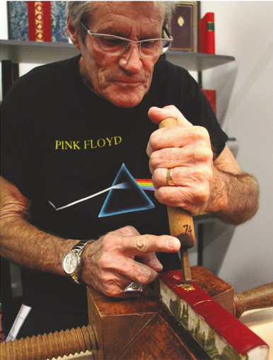 Dans le hall B du festival, à l’espace Beaux livres, Bernard Chauvière attire les foules. Entouré d’ouvrages anciens aux couvertures incrustées d’or, sourire aux lèvres, lunettes sur le nez, arborant fièrement un tee-shirt des Pink Floyd, le rockeur doreur se met au travail.
