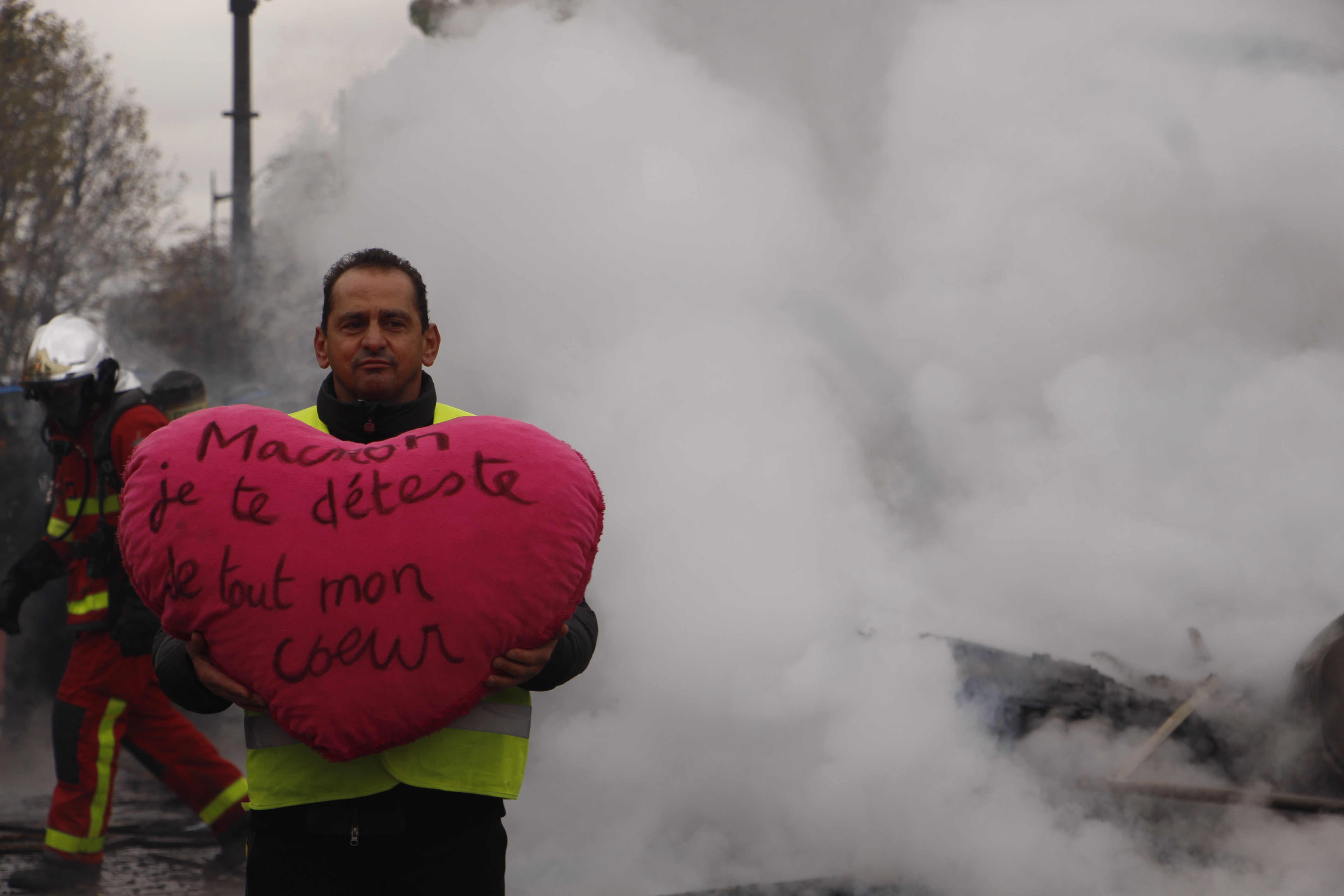 Des départs de feu, volontaires ou non, ont lieu sur toute la place. Une flaque d’essence au pied d’une voiture cassée s’enflamme après qu’une bombe lacrymogène tombe dedans. Des véhicules renversées brûlent, des trottinettes et des poubelles également. Une puissante chaleur se fait ressentir lorsqu’on s’en approche, l’odeur de brûlé s’ajoutant à celle des gaz. A chaque intervention des pompiers, les Gilets jaunes les remercient et les applaudissent.