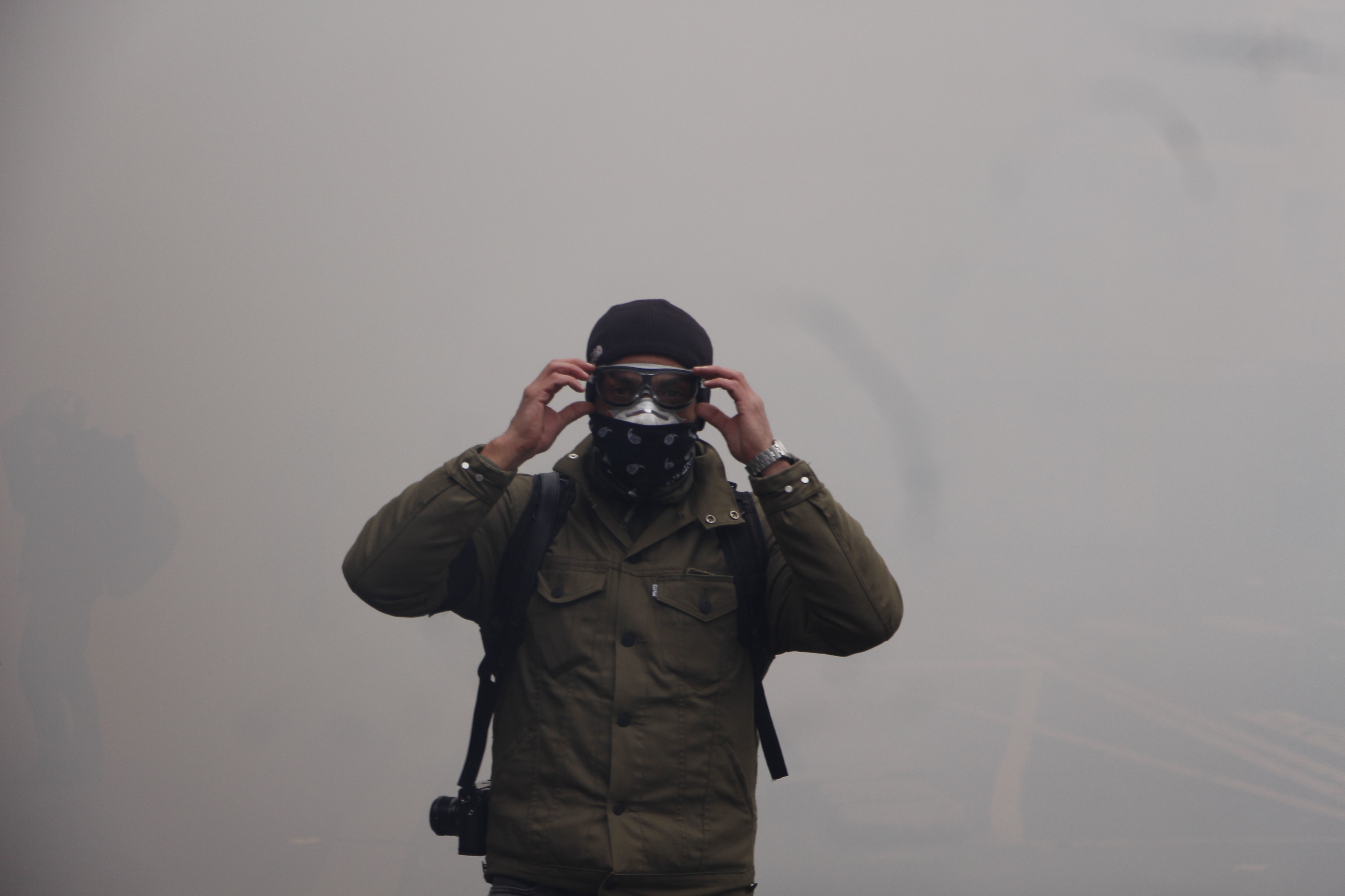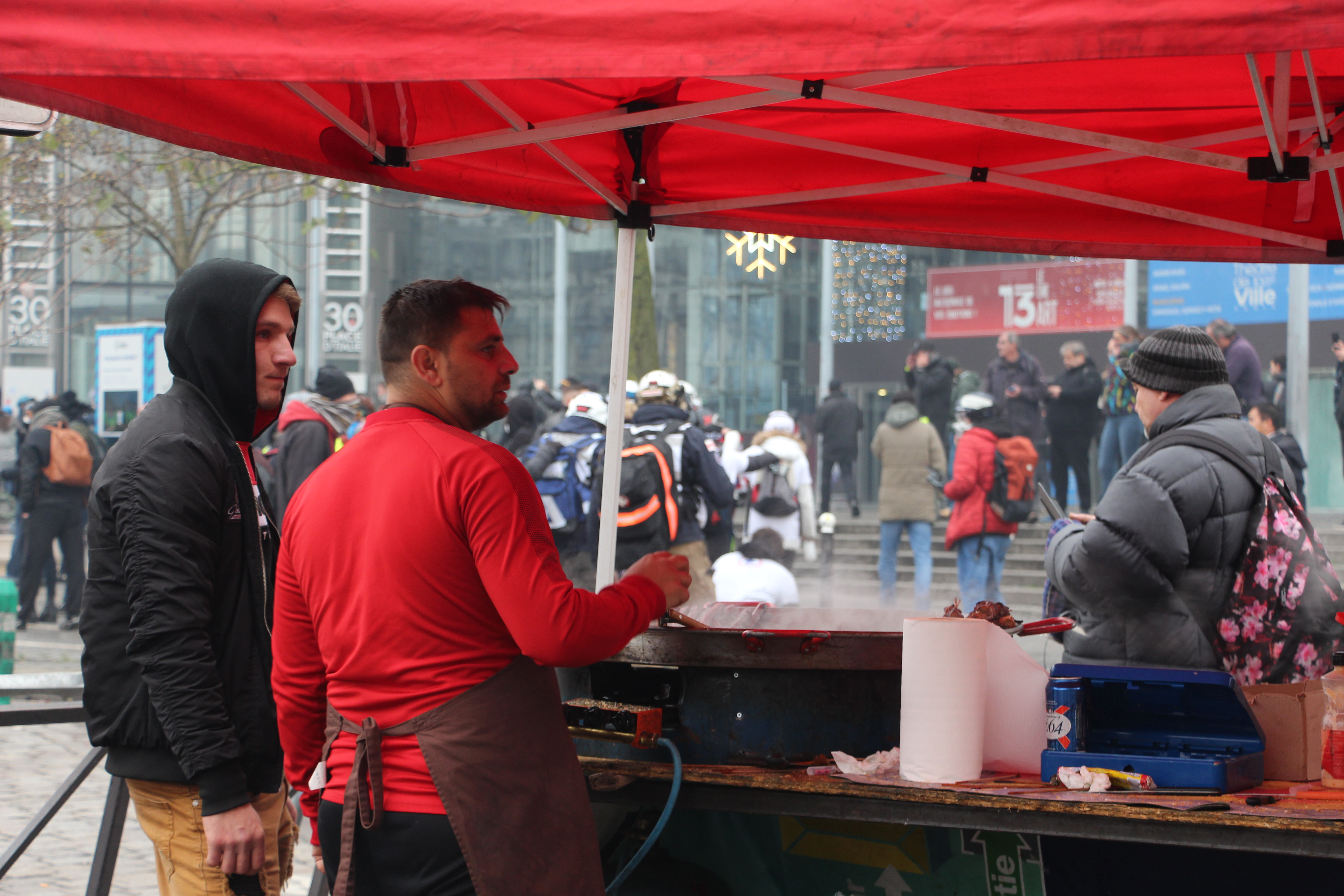 Au milieu de tout ça, des scènes presque absurdes rappellent le quotidien. Une réalité partiellement oubliée depuis quelques heures. Un homme choisit de profiter de la foule pour faire vivre son commerce : il vend des hot-dogs au milieu de l’épais brouillard toxique. Des livreurs Uber Eats passent au milieu des projectiles pour effectuer leurs commandes. Des touristes se prennent en photo devant des vitrines cassées de banques ou de fast-food. Un peu plus tôt, d’autres s’étonnaient que les magasins soient fermés.