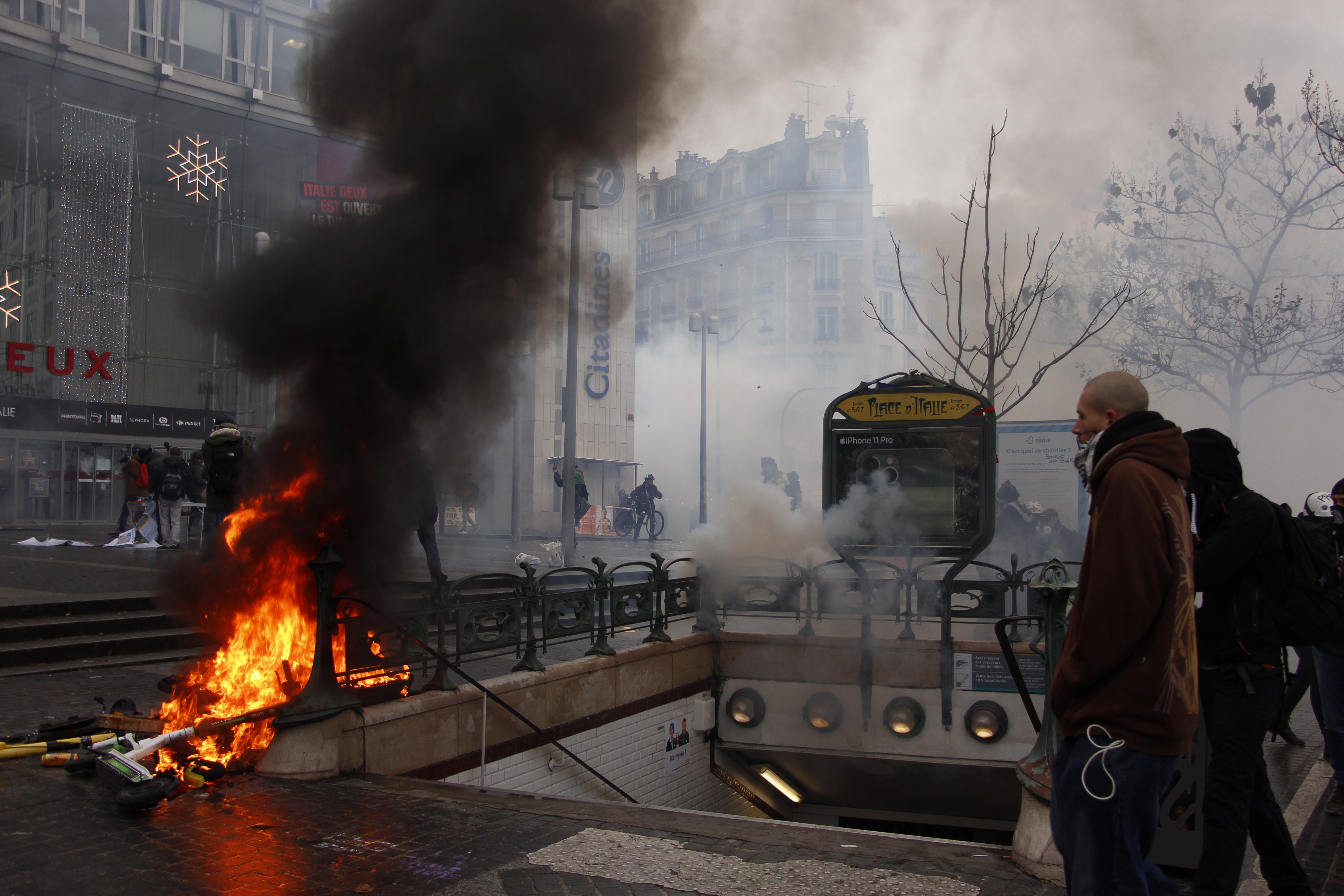 Place d’Italie, 12h30. Les forces de l’ordre ont bloqué l’ensemble des rues adjacentes, plus personne ne peut sortir mais tout le monde est autorisé à rentrer. La masse emprisonnée grandit. Des centaines de manifestants se positionnent devant le centre commercial Italie 2. Des cris et des slogans fusent : « Les casseurs sont au gouvernement », « Macron démission », « Travaille, consomme et ferme ta gueule ». Les premières bombes lacrymogènes sont tirées. Des nuages blancs étouffants recouvrent la foule qui se disperse pour mieux respirer. Toux. Crachat. Larmes. La fumée irrite tout le corps. Les manifestants répondent en lançant ce qu’ils trouvent : cailloux, bouteilles, déchets. Ils démontent une partie du monument de la place « afin d’avoir des munitions pour se défendre », explique l’un deux.