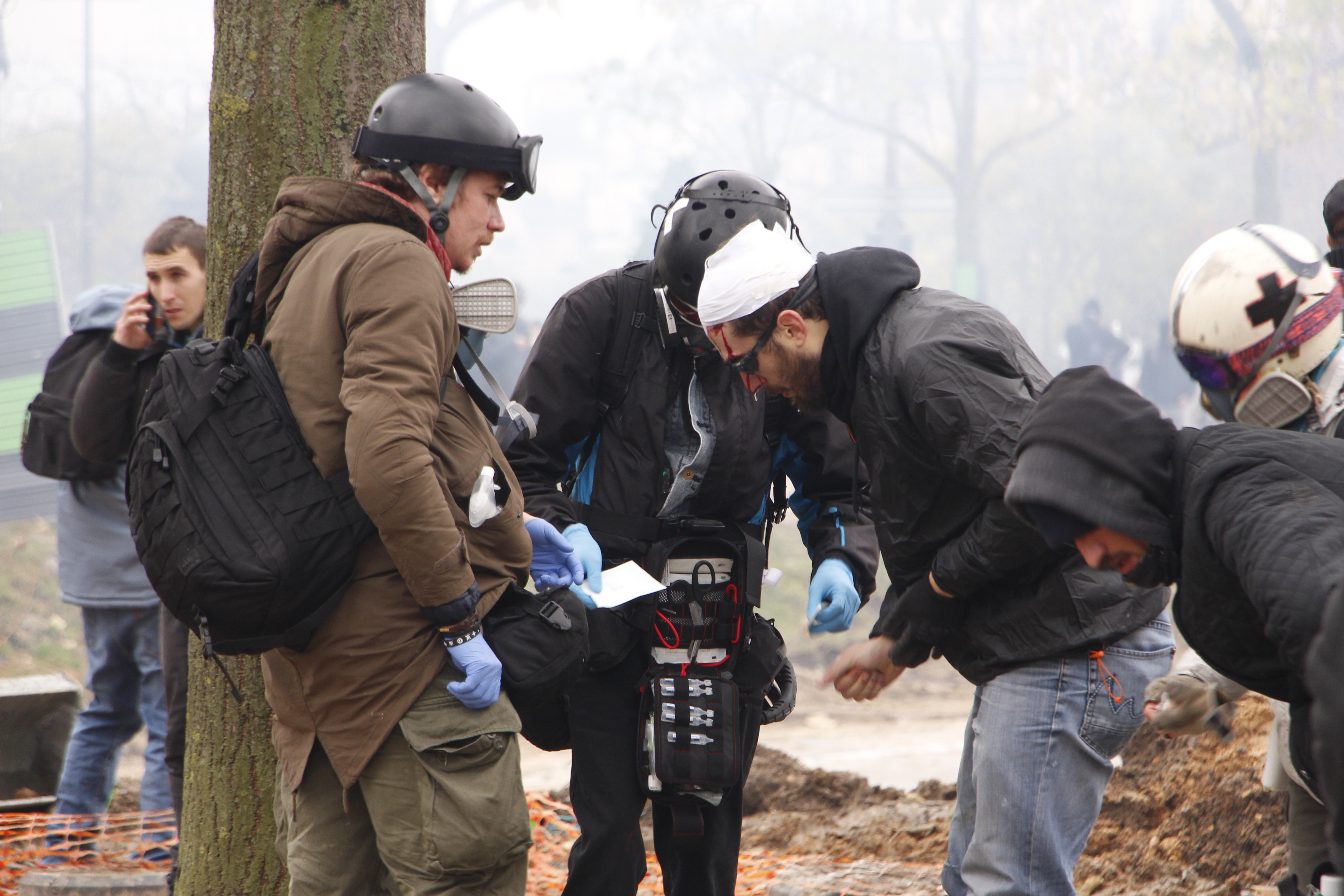 Des street-médic interviennent pour soulager les blessés. Ils courent de partout. Les groupes s’occupent tant des blessures superficielles (irritations dues aux gaz lacrymogènes) que des autres blessures. Crâne ouvert, genou saignant, douleurs après des coups de matraques… Un journaliste indépendant de 18 ans reçoit un tir de GLIF4 (Grenade Lacrymogène Instantanée) en plein visage. [NB : La France est le seul pays Européen qui utilise cette arme classifiée comme arme de guerre. Elle doit obligatoirement être tirée au sol à cause de sa dangerosité.] Son masque éclate alors en morceaux. Il est transporté à l’hôpital Salpêtrière.