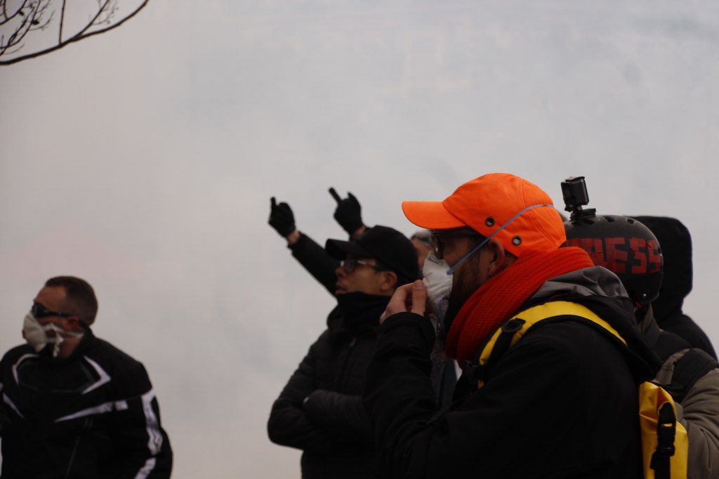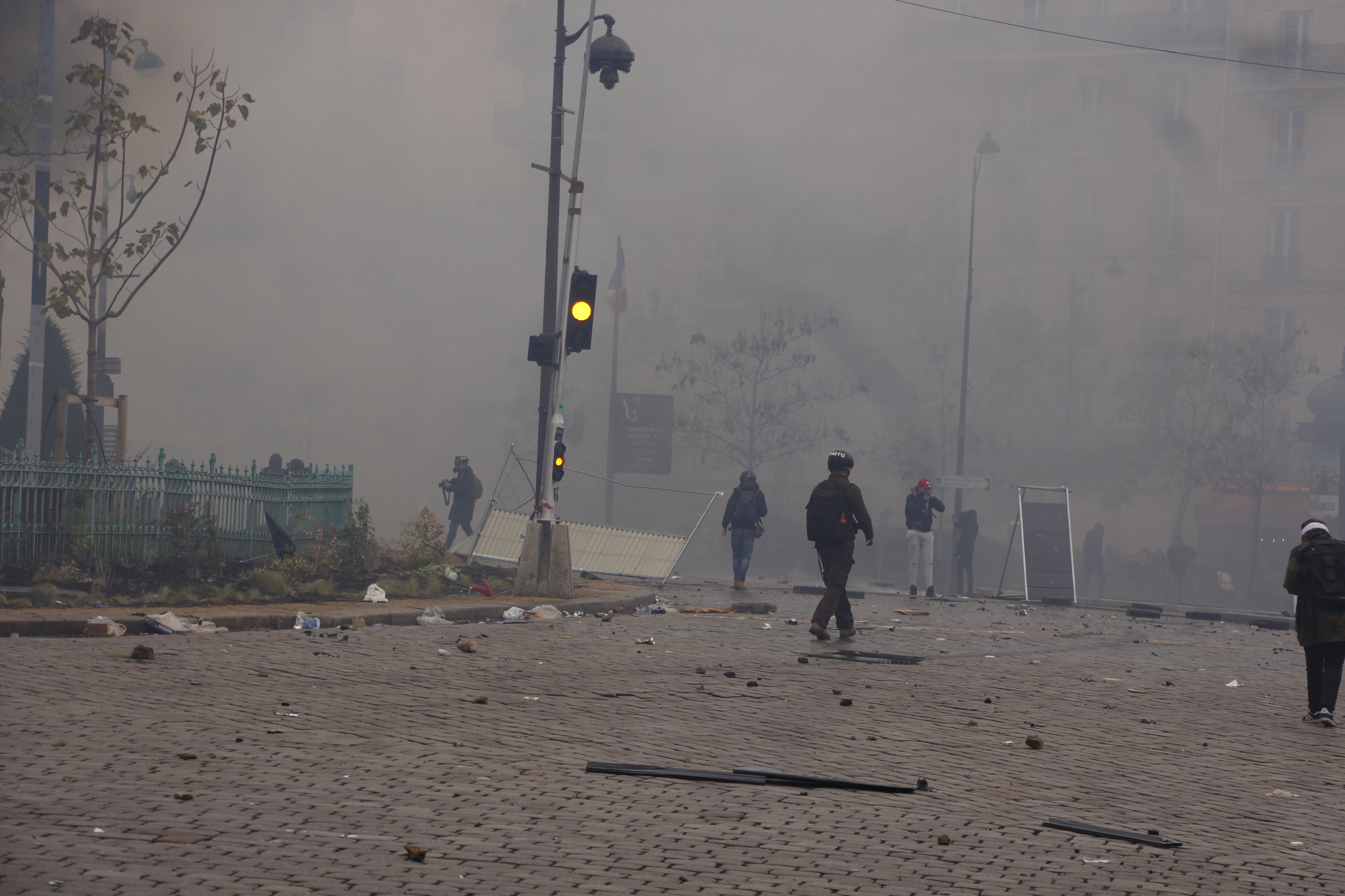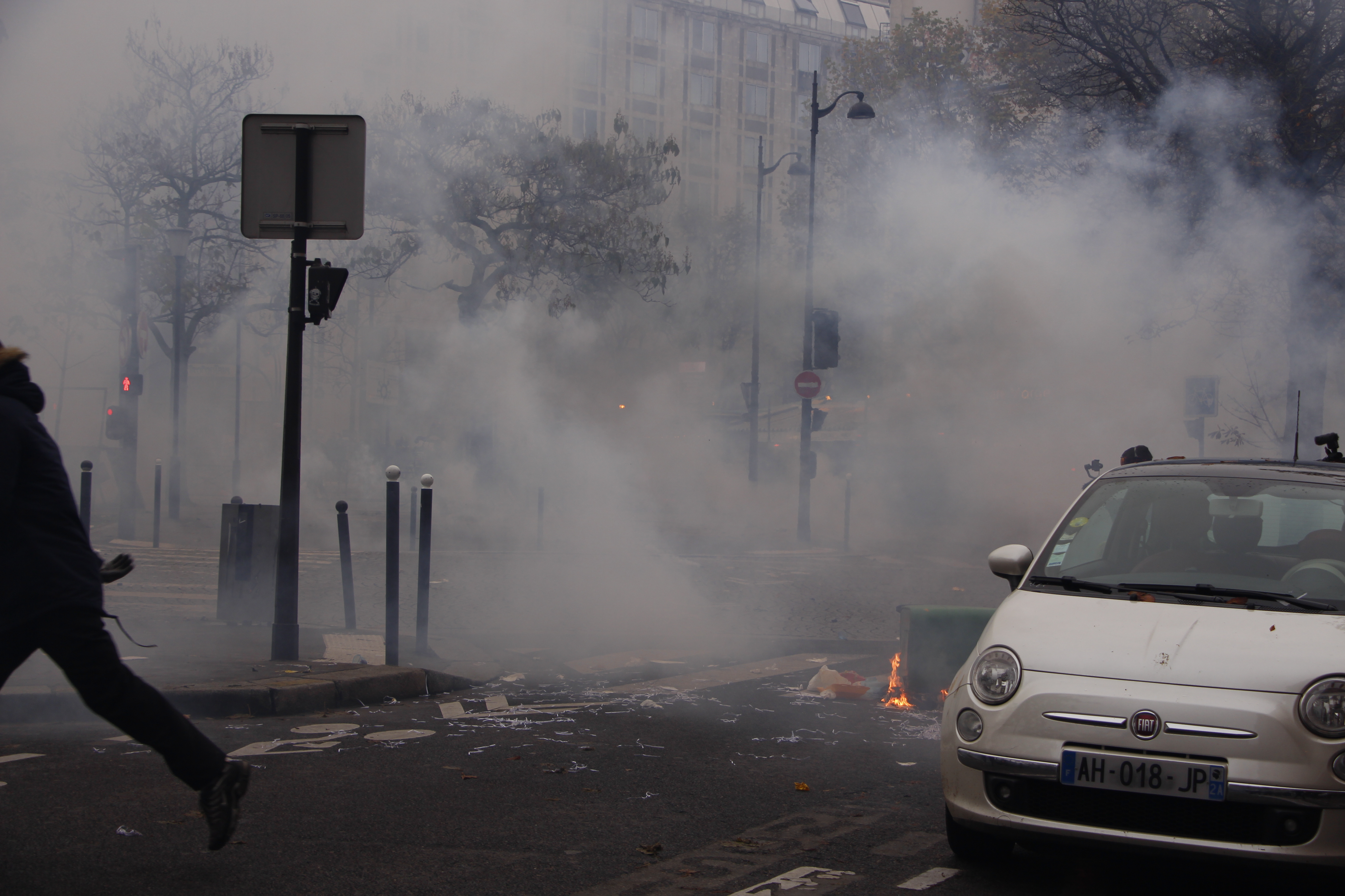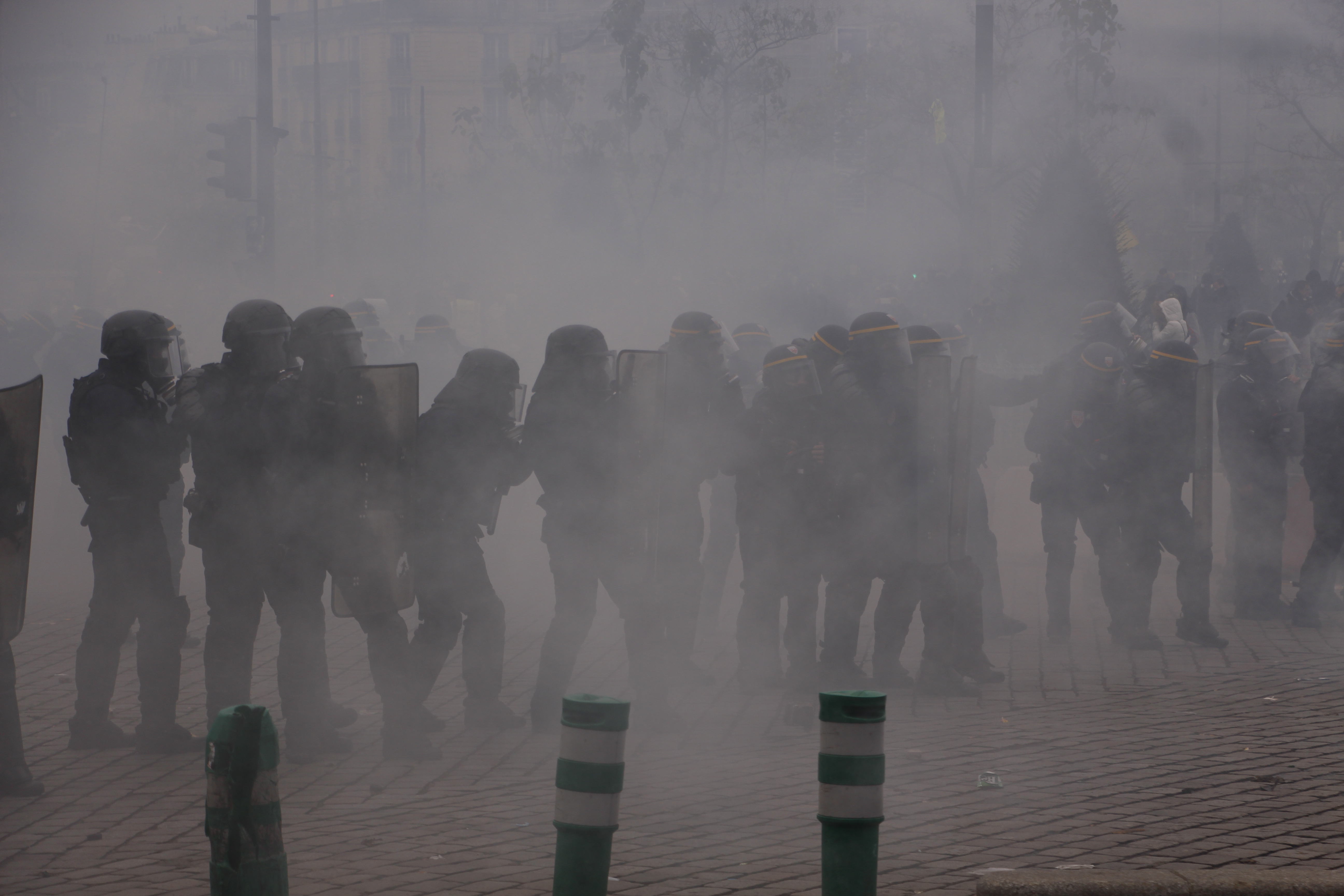 Un paysage apocalyptique vient remplacer l’image parfaite de la ville de Paris. Les fumées blanches se mélangent aux noires. Il semble faire nuit et pourtant, il n’est que 14h30. On tourne en rond depuis deux heures. C’est toujours la même routine. Gaz, pavés, feu, charge. On se déplace. Gaz, pavés feu, charge. Il n’y a pas d’issues possibles. Toutes les rues restent fermées.