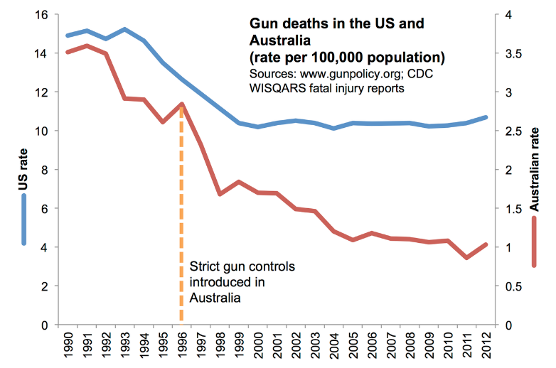 Le lien entre législation sur les armes et les violences par armes à feu a pourtant été prouvé par de nombreux travaux. Par exemple, en Australie, d’après une étude menée par Simon Chapman, Philip Alpers et Michael Jones, le durcissement des lois concernant les armes à feux aurait fait baisser le nombre de morts par fusillade. Suite au bannissement les fusils semi-automatiques et les fusils à pompe en 1996, le taux moyen de décès par arme à feux est passé de 3,6 à 1,2 par 100 000 habitants (voir le graphique ci-dessous). Au cours des 18 années qui ont précédé la réforme, 13 fusillades de masse ont eu lieu alors qu’aucune n’a eu lieu dans les 20 années qui ont suivis l’interdiction.