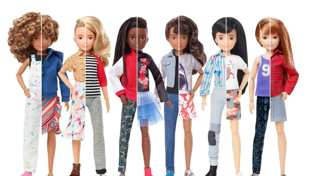 Une société américaine de jouet : Mattel, connu pour commercialiser la fameuse « poupée Barbie » depuis 1959, a créé cette année un panel de 7 poupées non genrées. Les poupées sont personnalisables. Leurs corps ne sont reliés à aucun genre distinct. Les poupées ont toutes des couleurs de peau différentes. Elles sont vendues avec des accessoires personnalisables, comme des perruques avec cheveux longs ou courts, des pantalons ou des jupes.