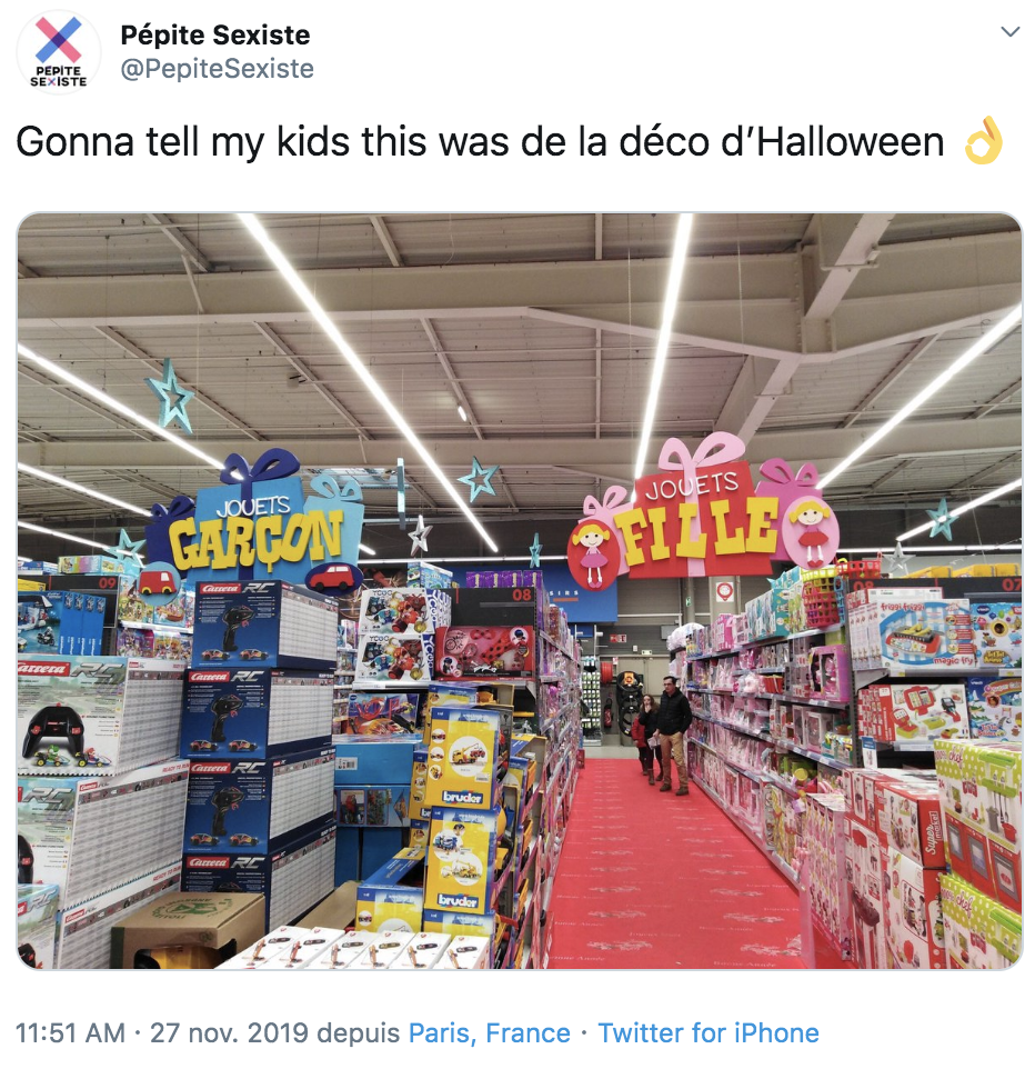 Un compte Instagram et Twitter Pépites sexiste relai en photos le marketing sexiste des marques. Ces codes sexistes sont fortement utilisés sur les jeux pour enfants. Selon plusieurs études, le marketing selon le genre, et la mise en vente d’un jouet en deux couleurs (bleu-rose par exemple) permet aux marques de booster leurs ventes.