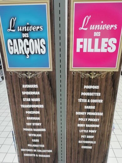 Il suffit de se déplacer dans un grand magasin pour jouet pour se rendre compte des représentations sexuées dans les jeux pour enfants. Les rayons sont différents selon les sexes. Dans les étalages aux couleurs bleu, vert, jaune et rouge : des tracteurs, des voitures, du bricolage, des super-héros, des ballons de foot, des paniers de baskets … Dans le rayon à côté, où le rose attire le regard, des poupées, des dinettes, des micros, des tapis de danse, des déguisements de princesse… Selon une étude menée par l’Institution Of Engineering and Technology, publiée en 2016, 89% des jouets dits « fille » sont de couleur rose.