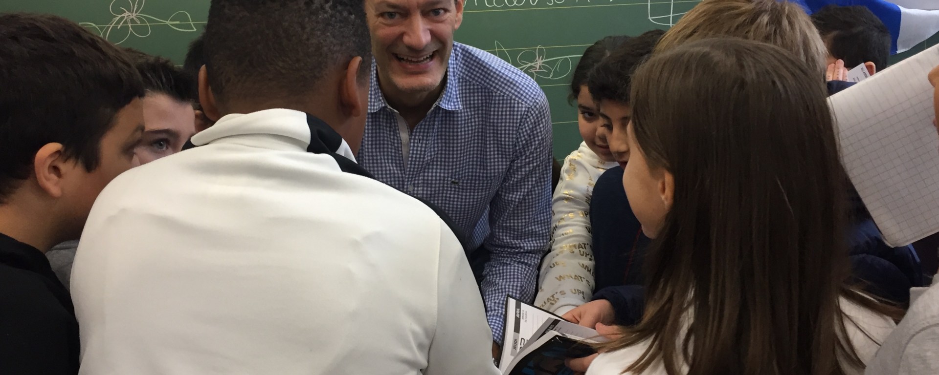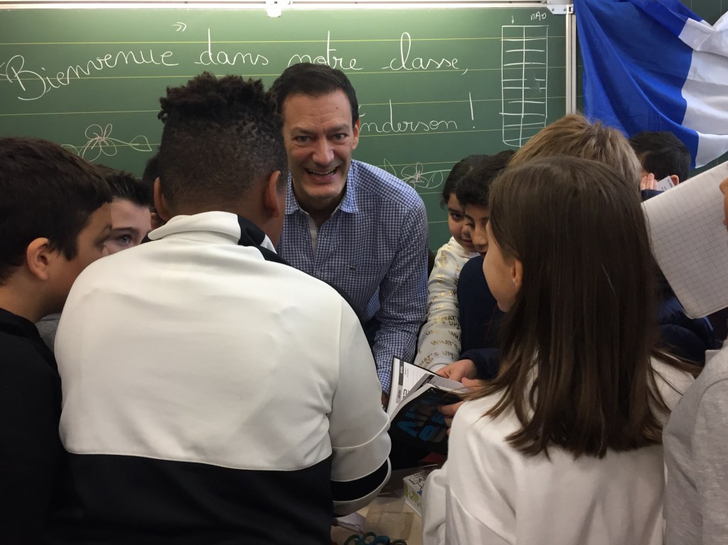 À 9 heures 15, le moment tant attendu arrive enfin : Eli Anderson fait son apparition devant le tableau vert. Les tables de multiplication qu’ils révisaient sont vite oubliées. Au début, les élèves de CM2 sont timides. Ils sont impressionnés de, comme le dit Clara, « rencontrer en vrai le Papa d’Oscar Pill », la série de romans fantastiques phares – et dont les droits viennent d’être achetés par la Warner Bross – d’Eli Anderson qu’ils ont étudié avec leur maitresse. Pour les détendre, l’écrivain mise sur une présentation humoristique. « Je suis donc Eli Anderson. Je suis très content d’être là car d’habitude je reste chez moi en pyjama à me gratter la fesse. » Fou rire général. La maîtresse rappelle qu’ils ont « une surprise » à donner leur invité : un acrostiche avec les lettres de son prénom. « Vous êtes de vrais artistes !», s’exclame-t-il.