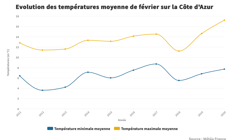 Lundi 10 février est pour l’instant le jour le plus chaud de ce mois de février du mois de février le plus chaud de ces dix dernières années sur la Côte d’Azur. Il a été enregistré une température de 23,3°C à la station météorologique de Nice, soit près de dix degrés de plus que les normales mensuelles. La température moyenne provisoire pour février 2020 est de 17,2°C, soit presque quatre degrés supérieure à la normale.
