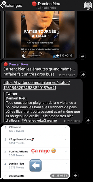Dès la nuit du 18 au 19 avril, le polémiste d’extrême droite, Damien Rieu, annonçait sur son compte Telegram un « très gros buzz ». Cette personnalité contestée du mouvement identitaire français n’a cessé dans les jours suivants de relayer toute information en lien avec d’éventuelles bavures policières pour les opposer à « une armée de petites racailles » et se vanter d’apparaitre dans les tendances France du réseau social à l’oiseau bleu.